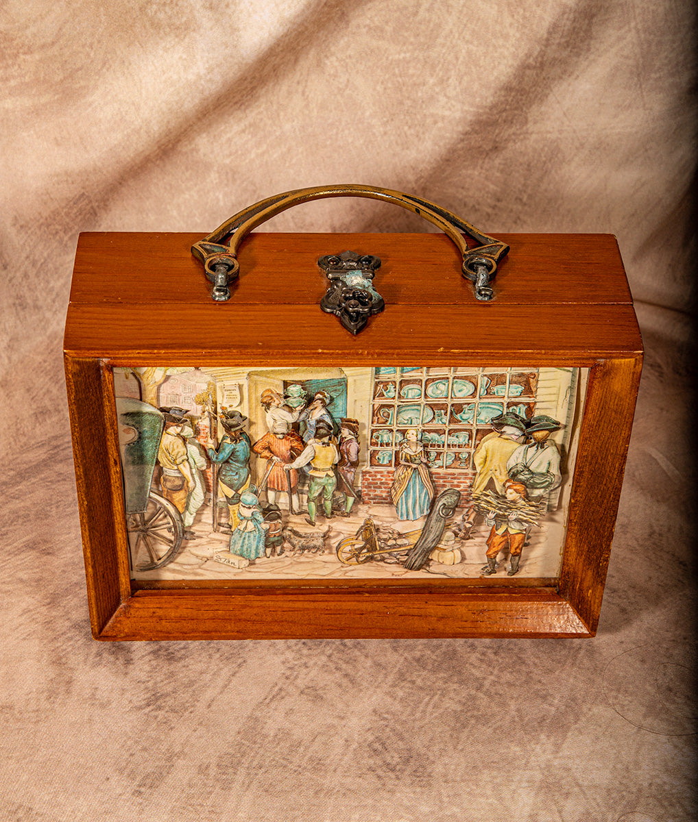 This handmade wooden jewelry box features a stunning 3D relief of a Paul Revere-era street scene. Each detail is carved and painted to capture timeless craftsmanship and charm. Perfect for storing keepsakes, jewelry, or as a decorative collectible that adds vintage warmth and history to any space.