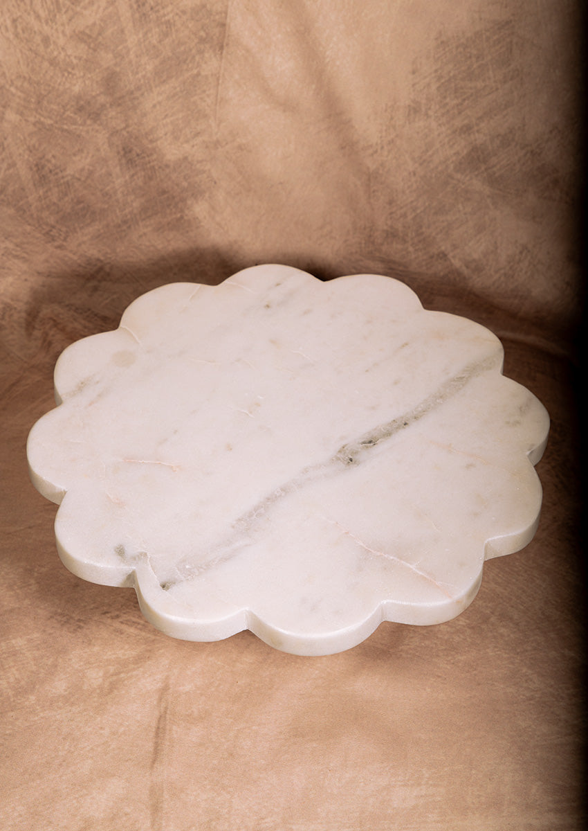 Scalloped Marble Cake Stand with Wooden Base – Elegant Dessert Display