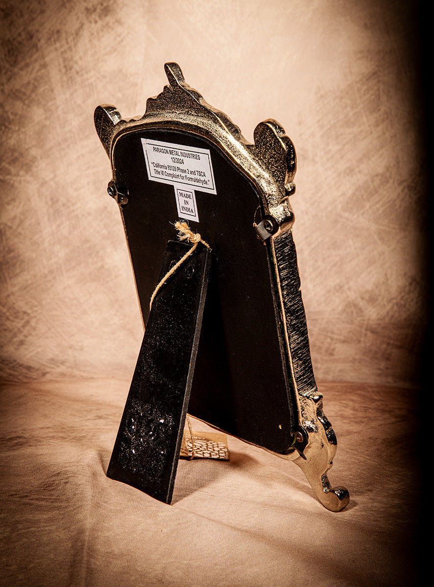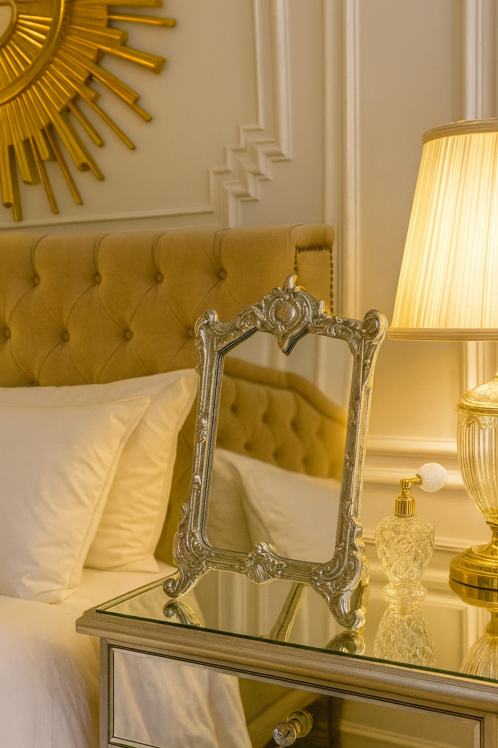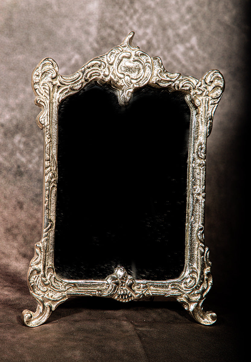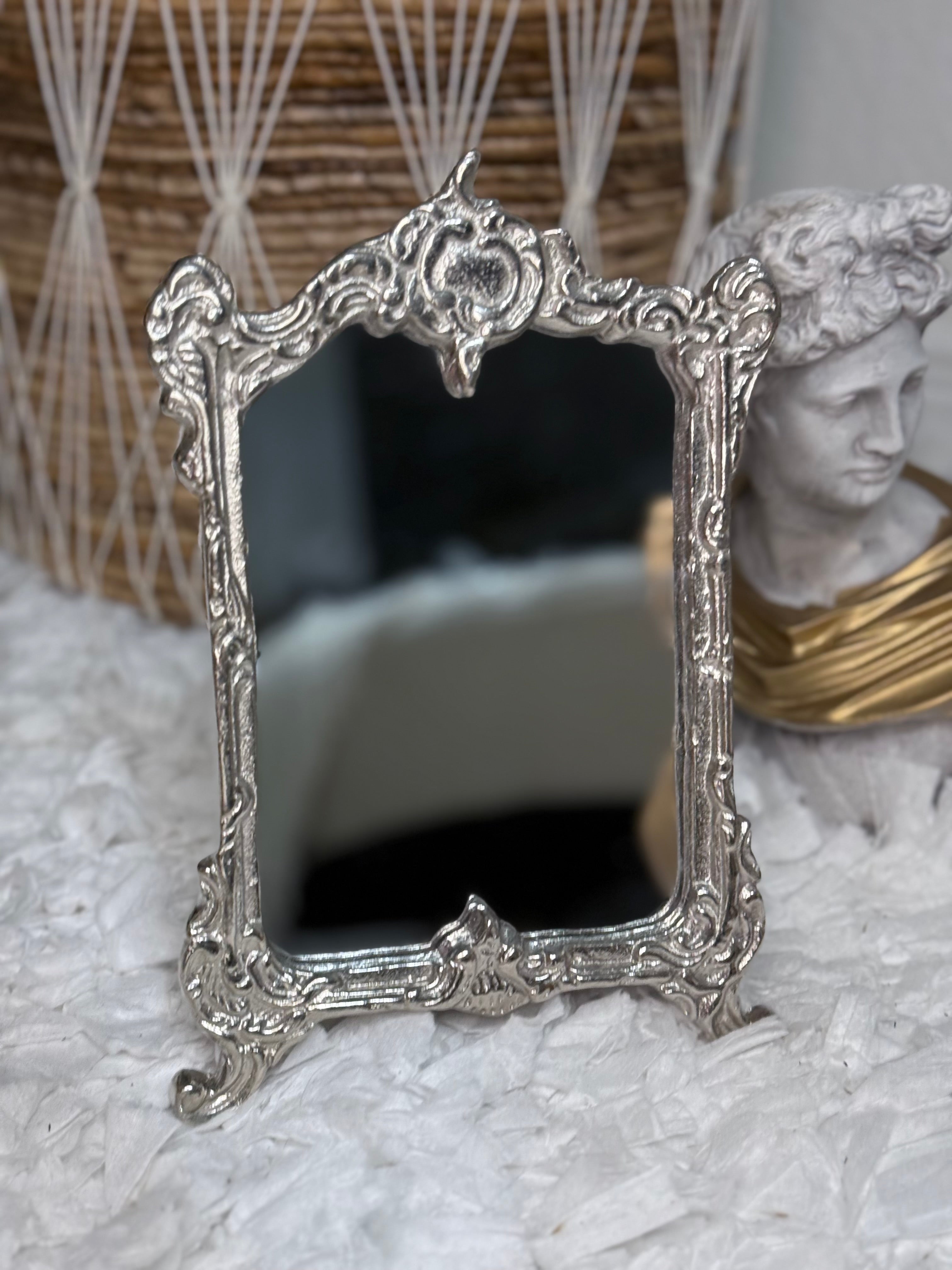 Inspired by Baroque opulence, this silver tabletop mirror features intricate scrollwork and antique elegance. Its polished metallic finish adds a timeless glow, ideal for vintage, Gothic, or Hollywood Regency interiors. Both decorative and functional, this piece transforms any vanity or bedside table into a moment of art — a reflection framed in history and grandeur. Approximately 6 1/2”x 9 1/2” |