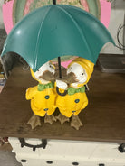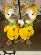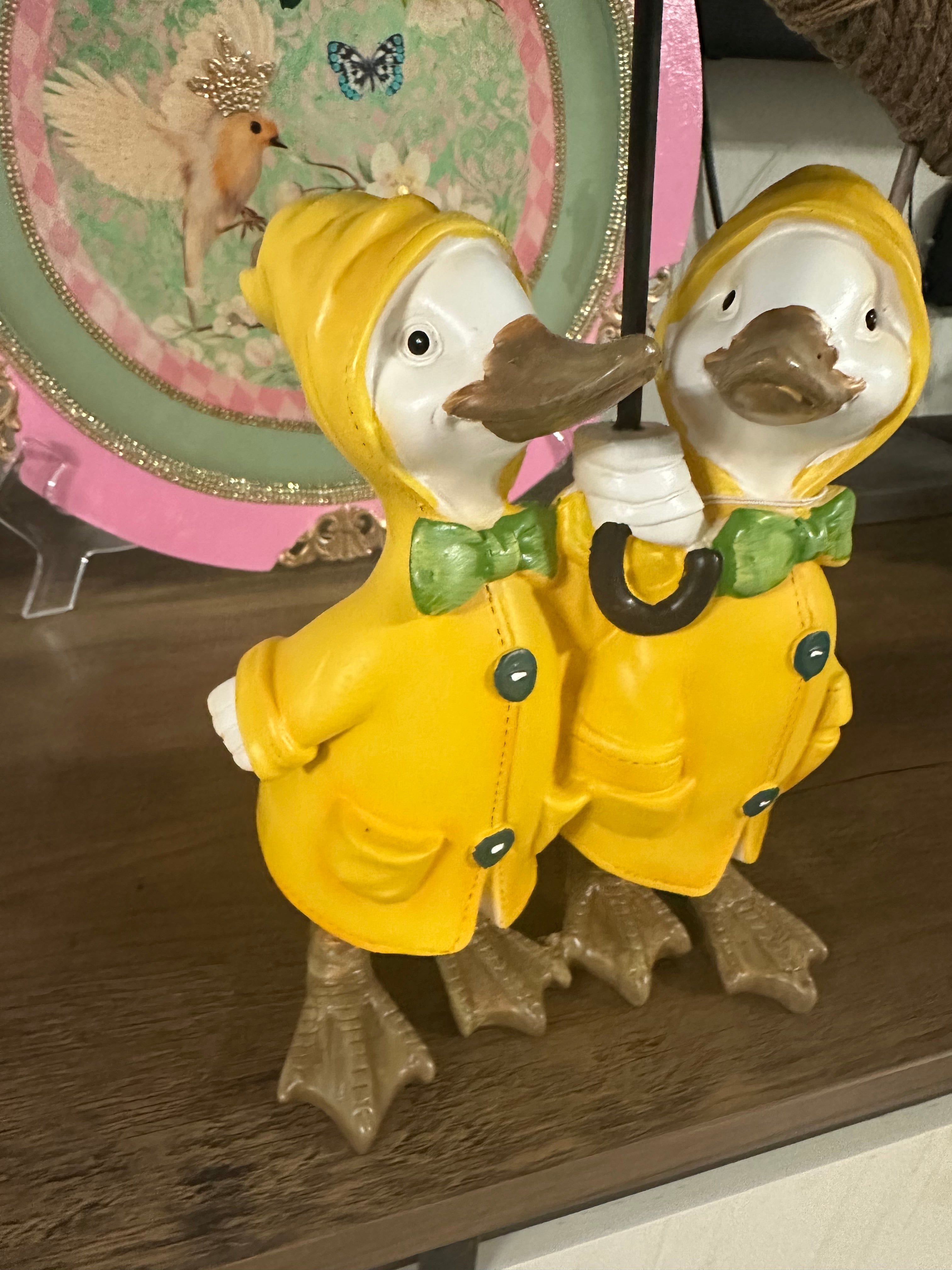 Add a touch of whimsy to your home decor with this charming figurine featuring ducks wearing yellow raincoats and holding a green umbrella. Perfect for the spring season, this piece is sure to bring a smile to your face and add a playful touch to any room. Crafted with care and attention to detail, this figurine is a great addition to any collection of decorative collectibles. Whether you're looking to brighten up your living space or add a unique touch to your office, this Home Decor brand figurine is a great choice. With its vibrant colors and delightful design, it's sure to be a conversation starter. Don't miss out on the opportunity to add this delightful piece to your collection today! 6.5”x10.5” Approximately  |