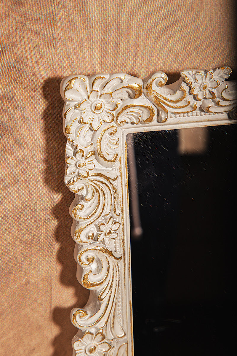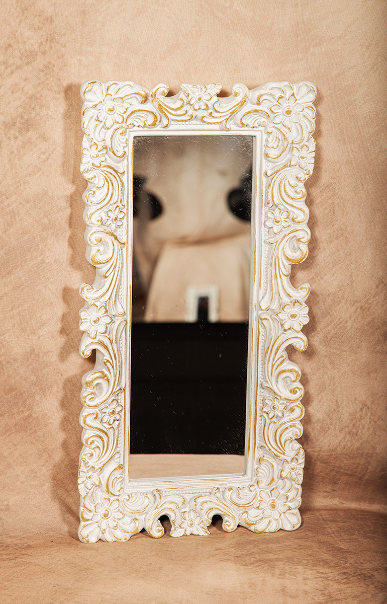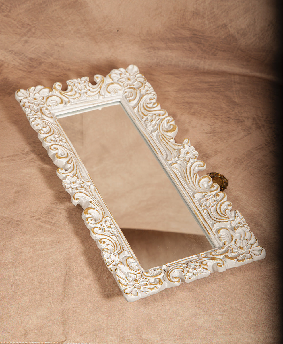 This ornate mirror tray captures the timeless beauty of classical design with its intricate baroque-style frame and luminous reflective surface. Finished in a soft antique white, it brings a sense of vintage romance to any room. Perfect for displaying perfume bottles, candles, or small sculptures, the tray adds depth and light to your décor with its delicate scrollwork and mirror base. Whether styled on a vanity, coffee table, or entryway console, it creates a graceful and refined focal point.