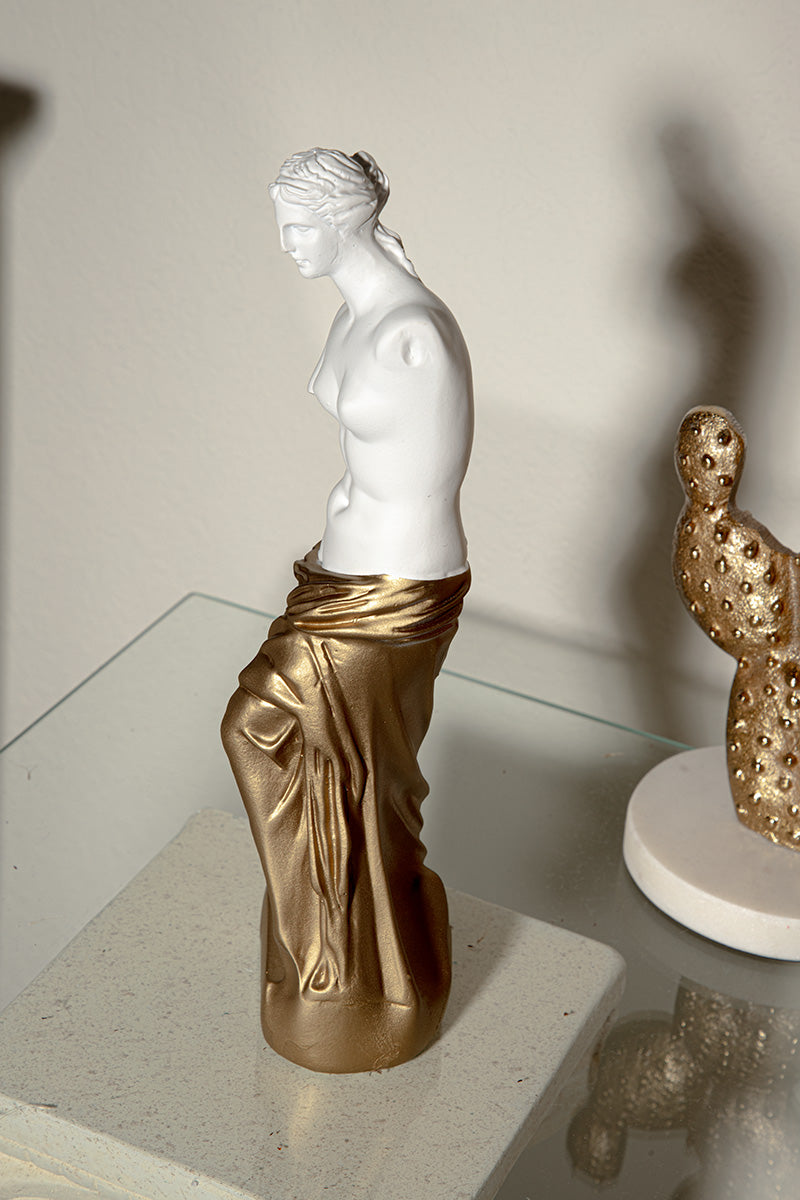 Channel timeless beauty with this Gold & White Venus Statue, inspired by the legendary Greek Goddess of Love. This medium-sized resin sculpture captures classical elegance with a modern twist — pairing a pure white bust with flowing golden drapery for a refined yet contemporary look.