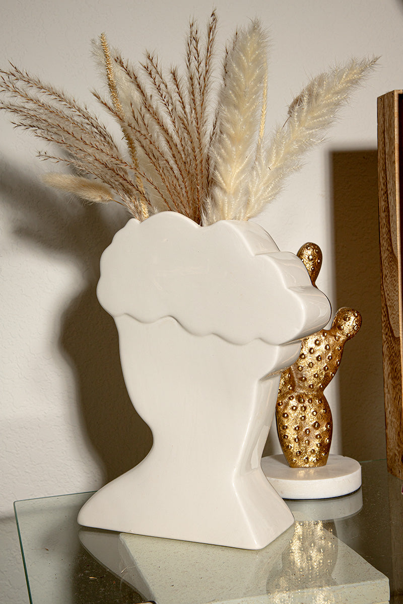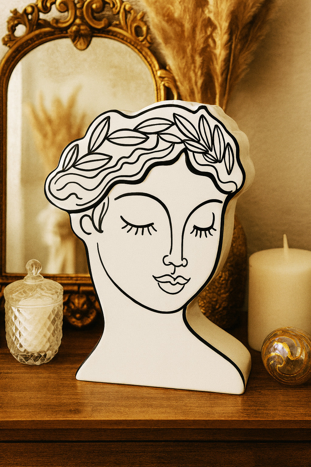 This Greek goddess vase blends ancient muse energy with modern minimalism. Designed in sleek white ceramic with bold black line art, it captures the serenity of classical sculpture while serving as a functional vase or planter. Perfect for dried florals, pampas grass, standalone decorative accent.or minimalist greenery, this piece transforms any shelf or vanity into a temple of balance and beauty. A poetic fusion of geometry, femininity, and timeless design — curated for the visionary home.