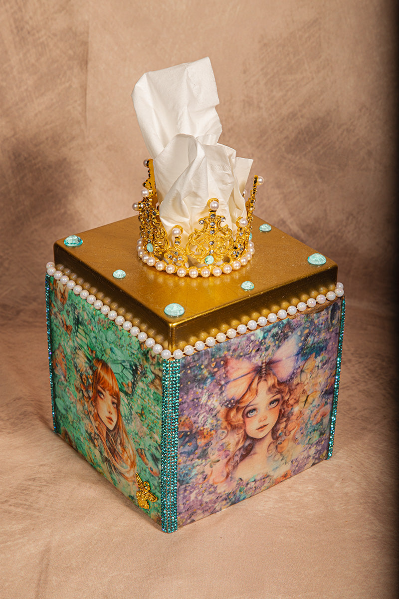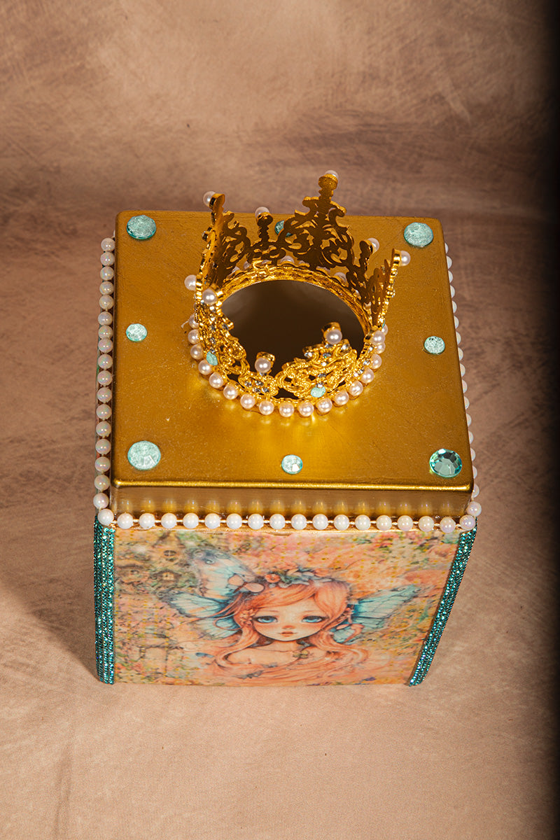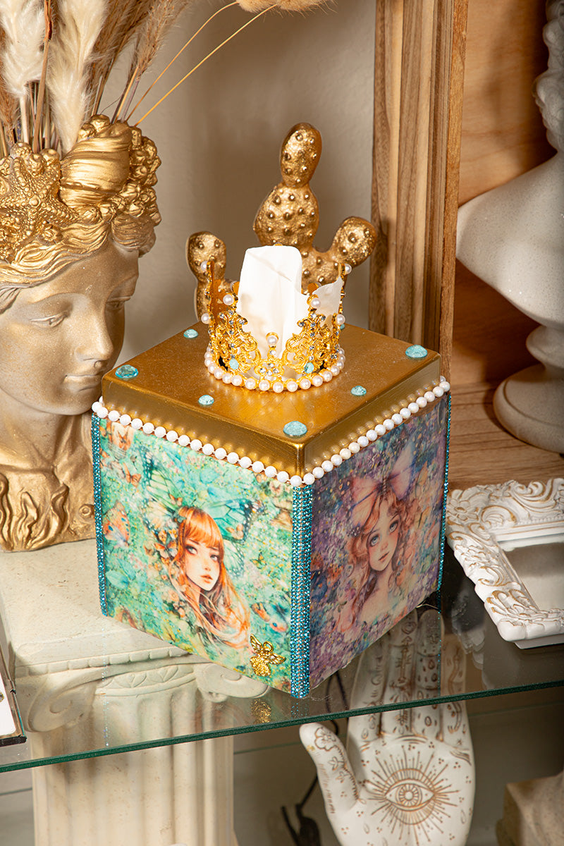 Transform an everyday essential into a regal art object with this one-of-a-kind Royal Crown Tissue Box Cover, handcrafted in U-Turn Utopia’s signature mix of rococo romance, surrealist art, and opulent whimsy.