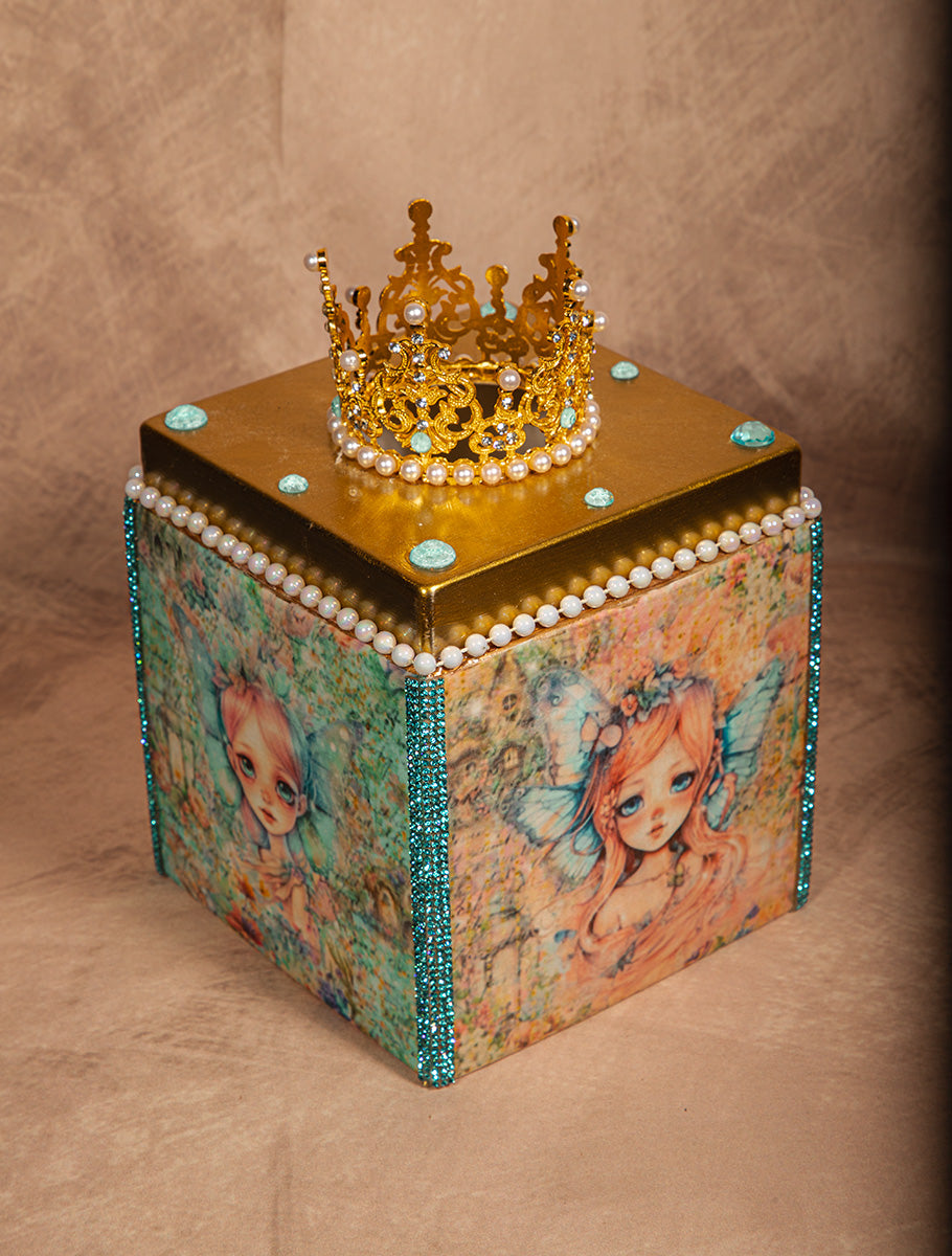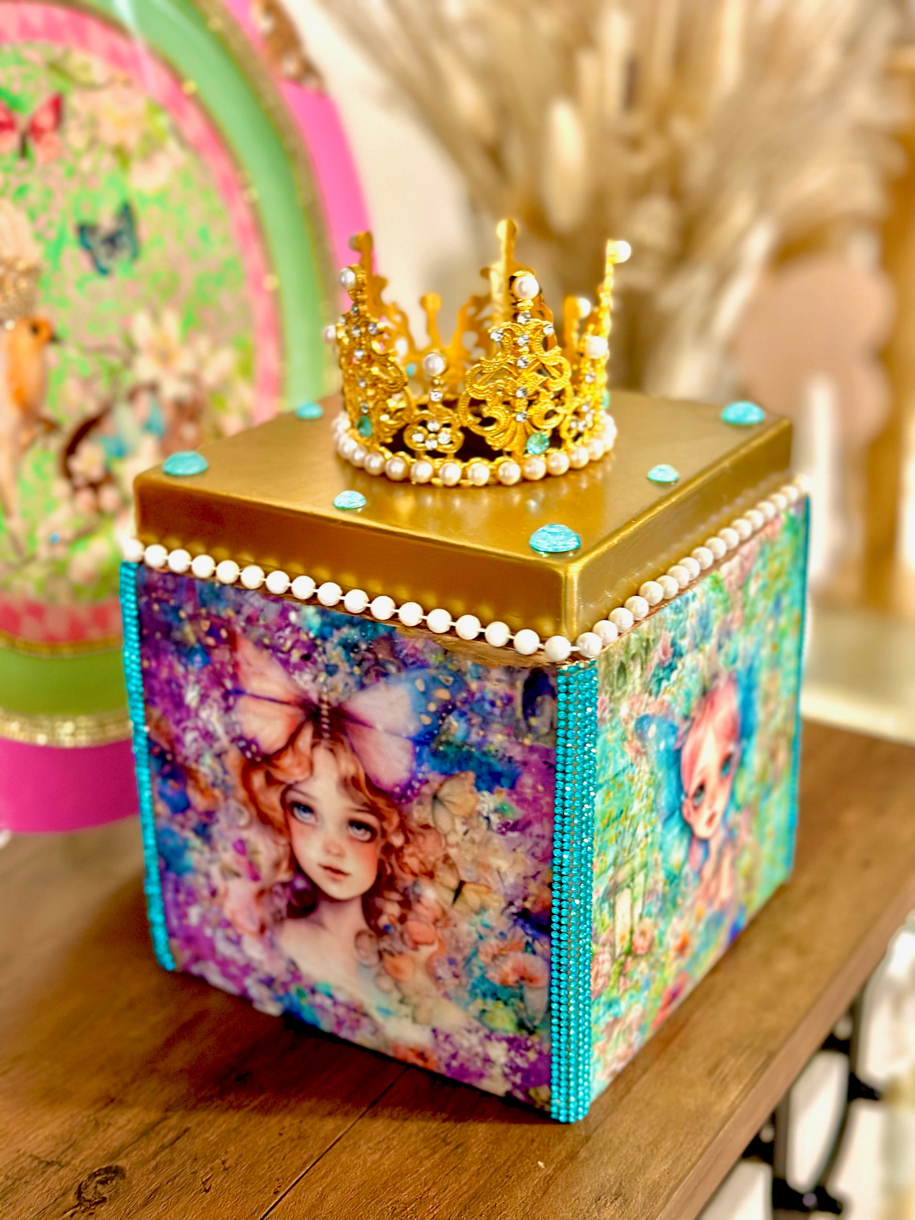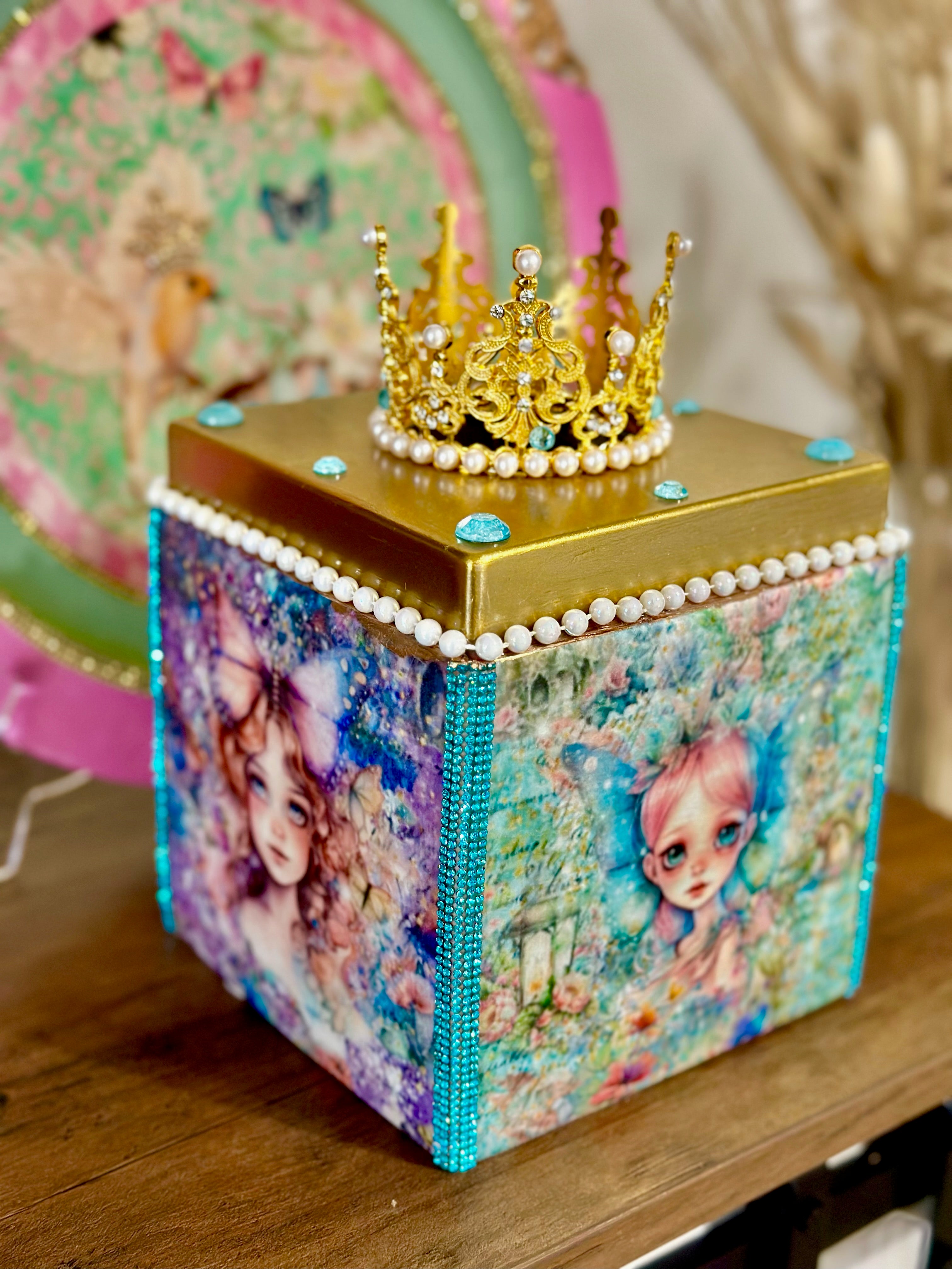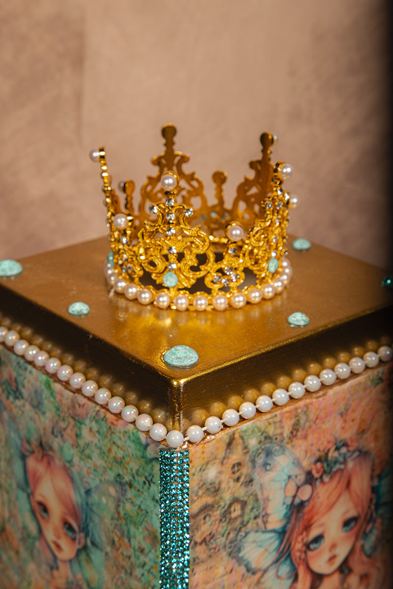 Each side features dreamy feminine portraits framed by iridescent beading, butterfly motifs, and jewel-toned accents. The top is crowned in glimmering gold — an ornate tiara adorned with faux pearls, rhinestones, and textured embellishments reminiscent of antique European treasures.