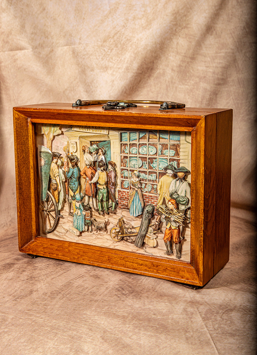 This handmade wooden jewelry box features a stunning 3D relief of a Paul Revere-era street scene. Each detail is carved and painted to capture timeless craftsmanship and charm. Perfect for storing keepsakes, jewelry, or as a decorative collectible that adds vintage warmth and history to any space.
