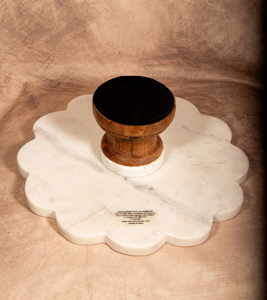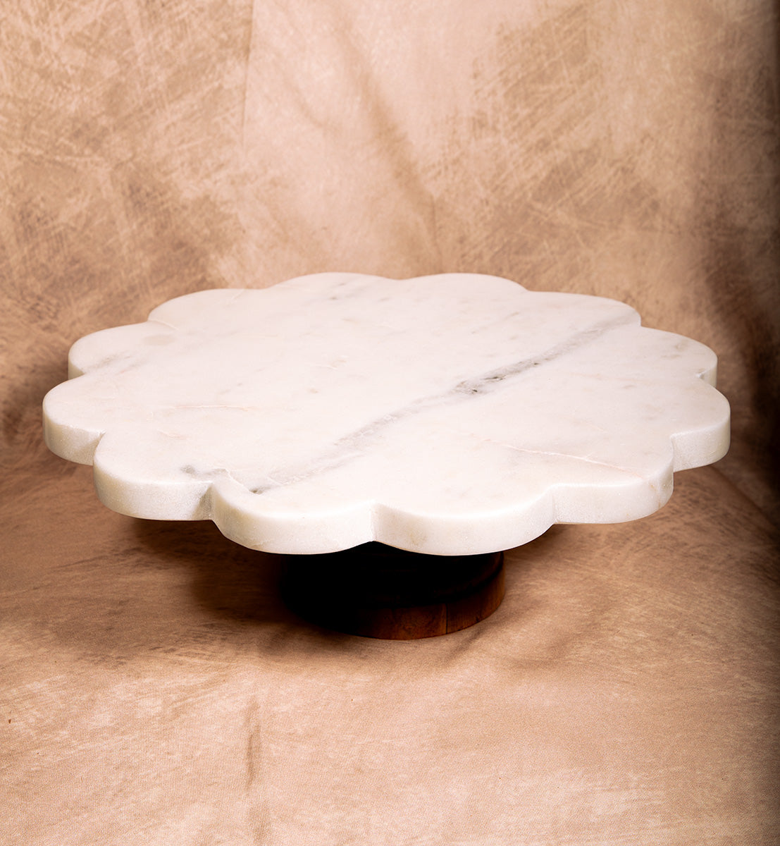 Scalloped Marble Cake Stand with Wooden Base – Elegant Dessert Display