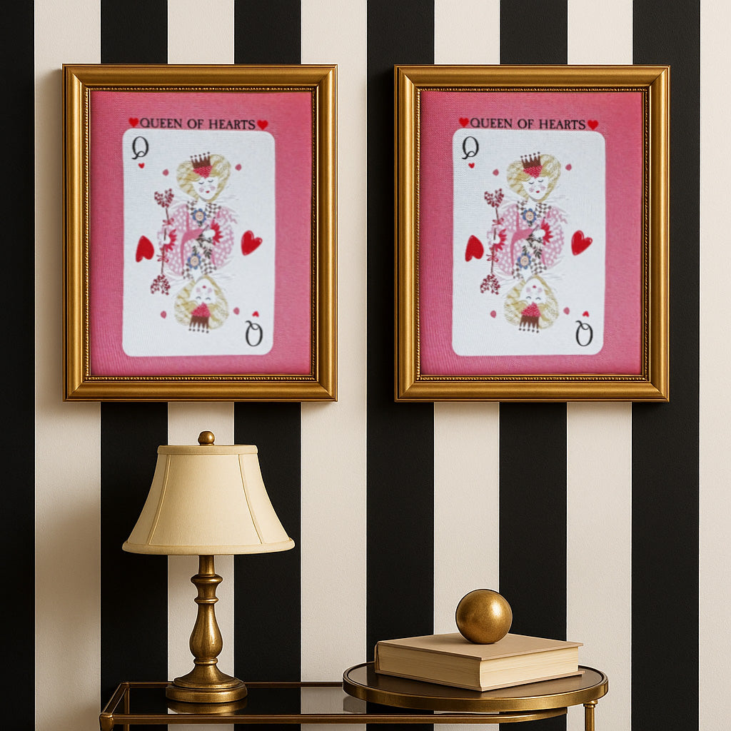 This charming Queen of Hearts artwork brings storybook romance and playful elegance to your space. Printed on textured canvas with a soft blush background, the design feels whimsical yet refined, making it ideal for bedrooms, nurseries, reading nooks, or curated gallery walls. The piece is beautifully finished in an ornate gold frame with beaded detailing, adding a touch of vintage charm and warmth. Subtle painterly textures and delicate color tones give the artwork a handcrafted feel without overwhelming the space. Ready to hang and easy to style, this framed print offers a delightful balance of classic fairytale inspiration and timeless decorative appeal.