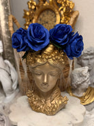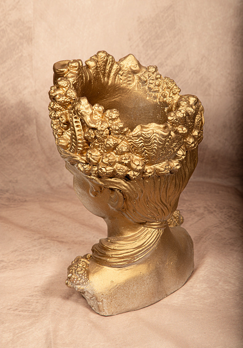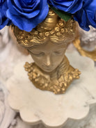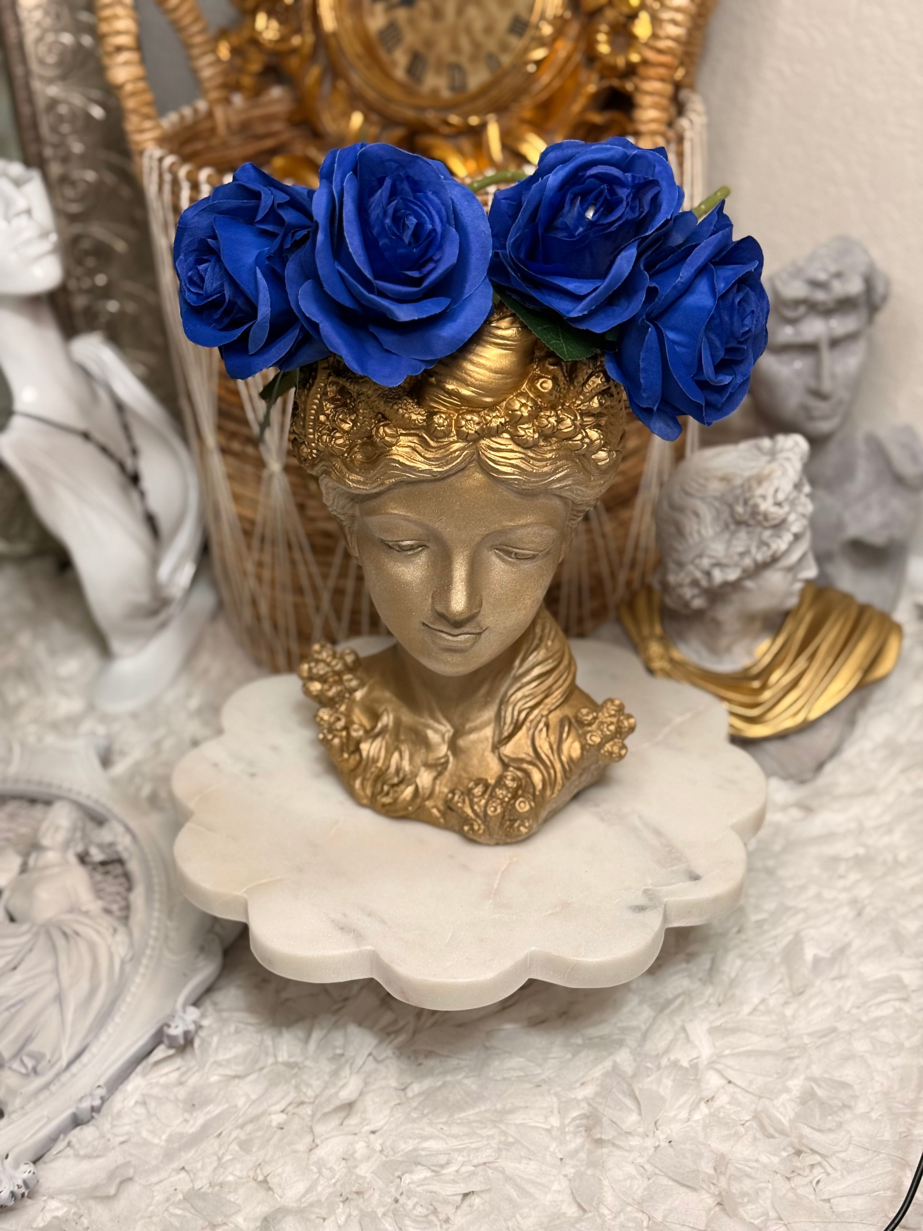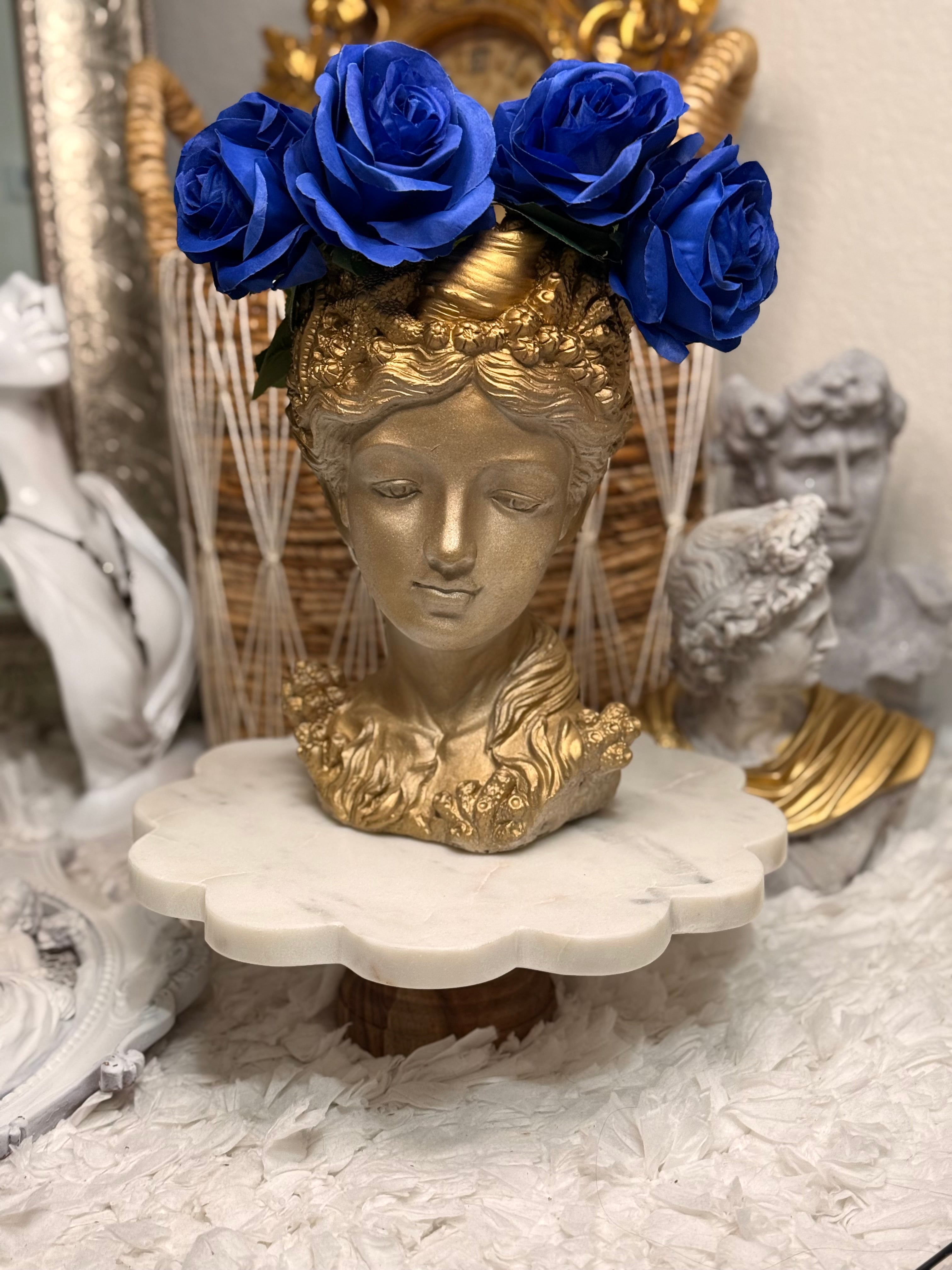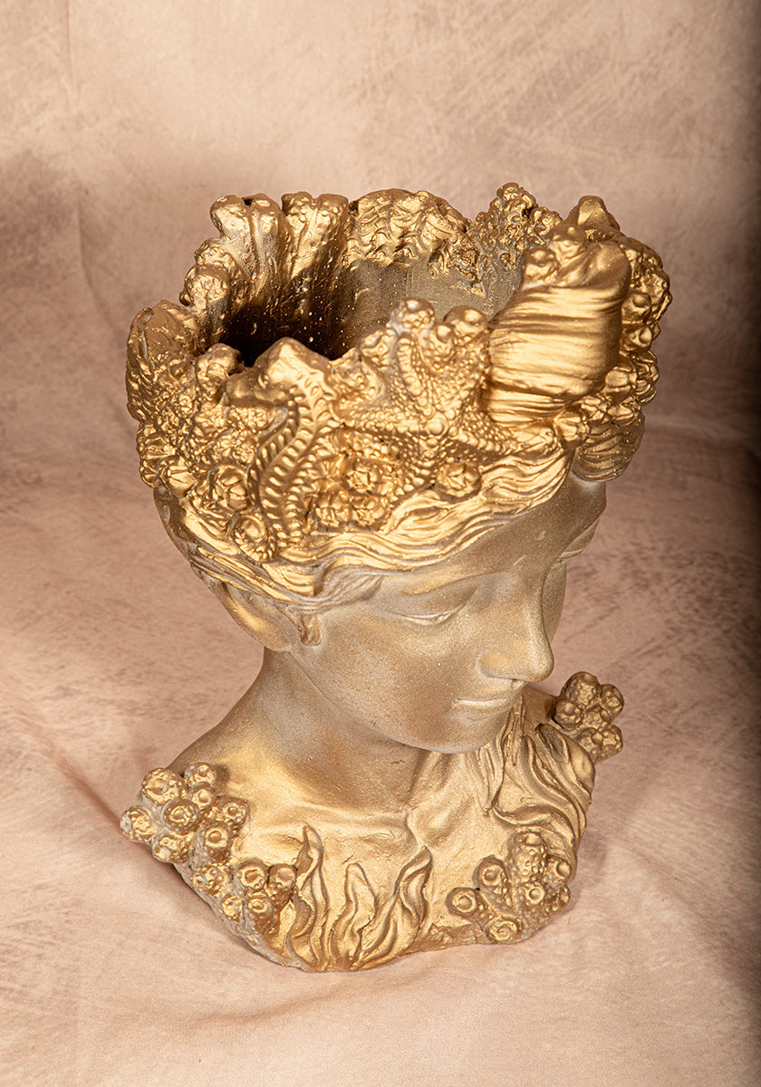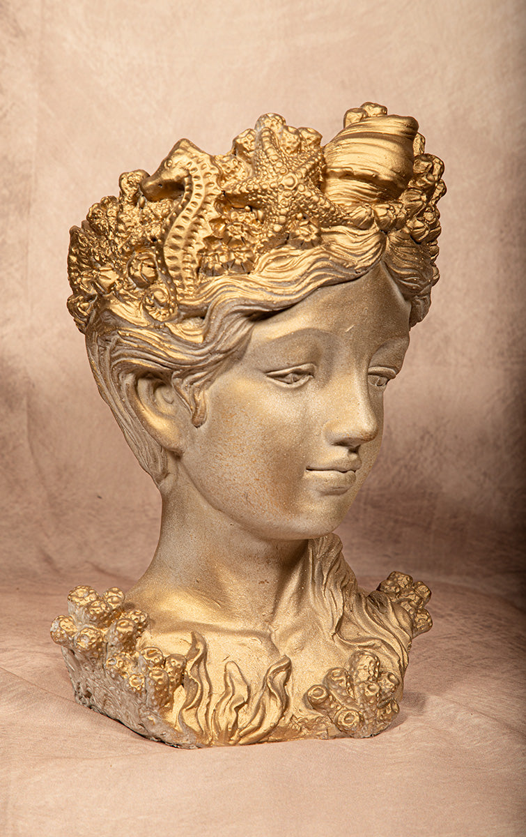 Channel the elegance of myth and sea with this handcrafted golden goddess bust. Detailed with seashells, coral textures, and a serene expression, this coastal-inspired statue evokes timeless charm and divine femininity. Perfect for vanities, mantel displays, or art-themed interiors. Blue roses not included.