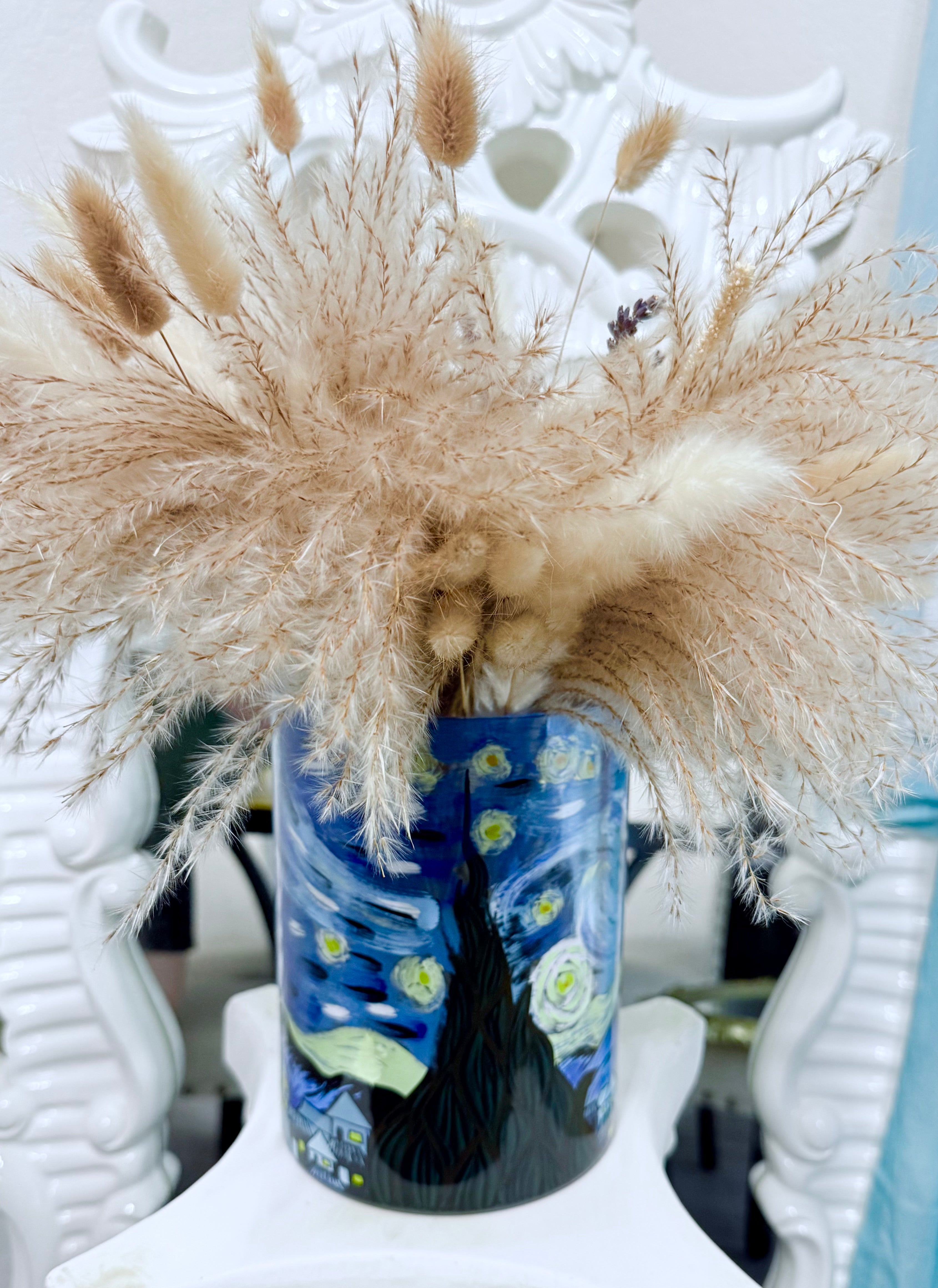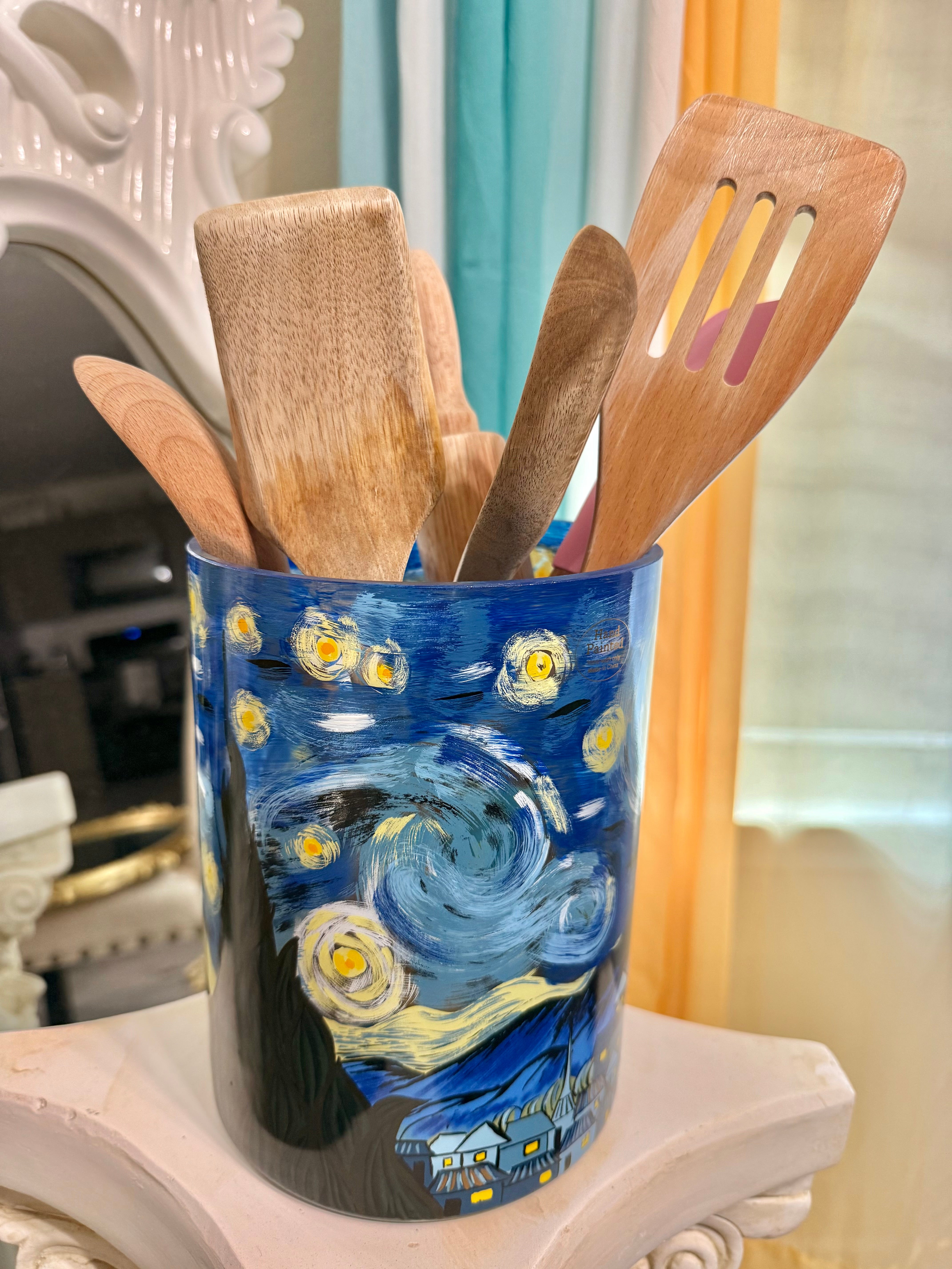 Bring art to life in your home with this Starry Night hand-painted cylinder vase, inspired by Vincent van Gogh’s iconic masterpiece. Each brushstroke captures the swirling midnight blues and luminous yellows of the original painting, transforming your space into a gallery of color and light. Perfect as a statement vase, utensil holder, or artistic centerpiece, this unique glass piece embodies U-Turn Utopia’s blend of fine art and everyday elegance. Ideal for boho, eclectic, or art-inspired interiors. Approximately 6"x6"x8" #flowers and utensils are not included. |