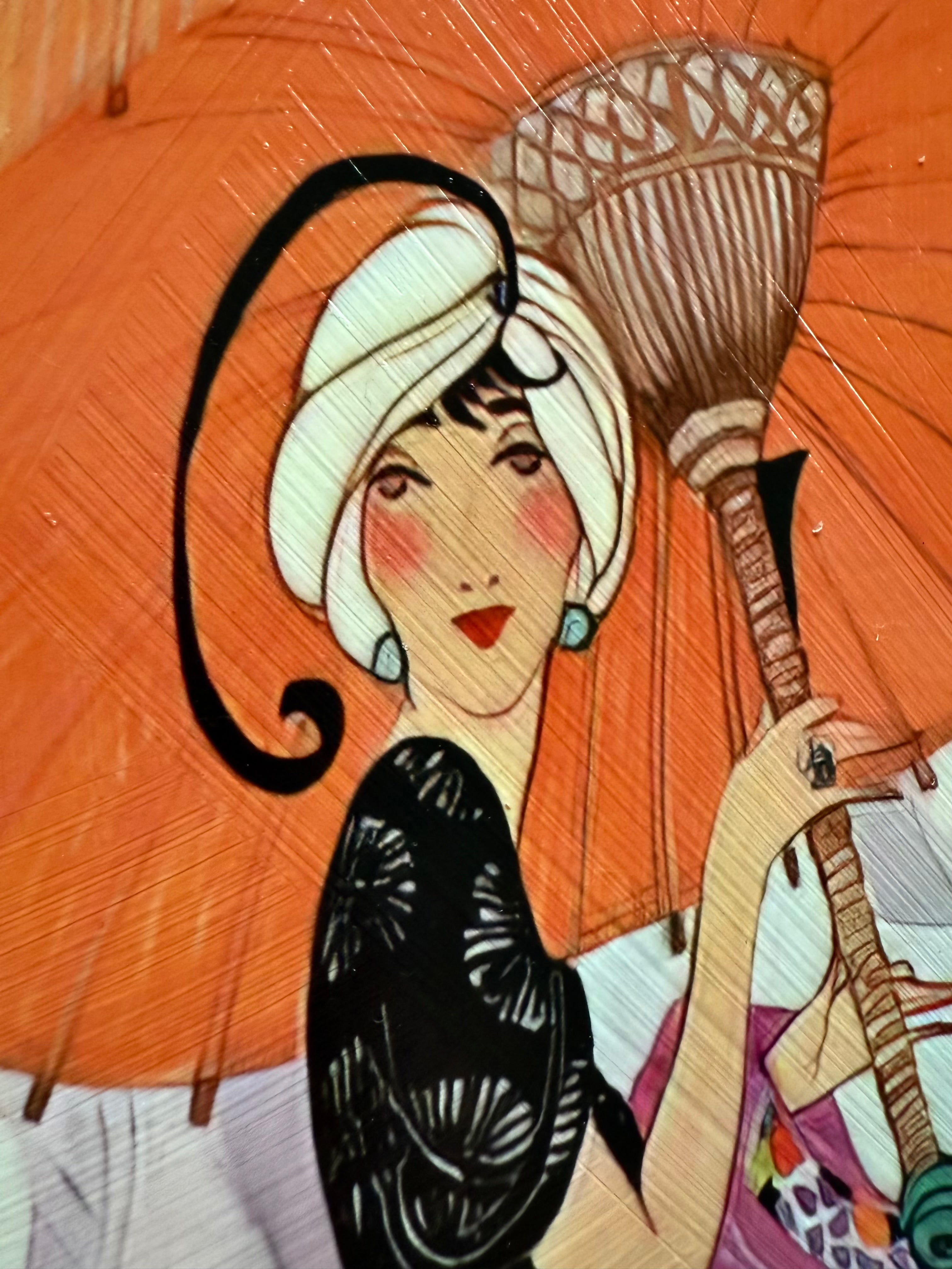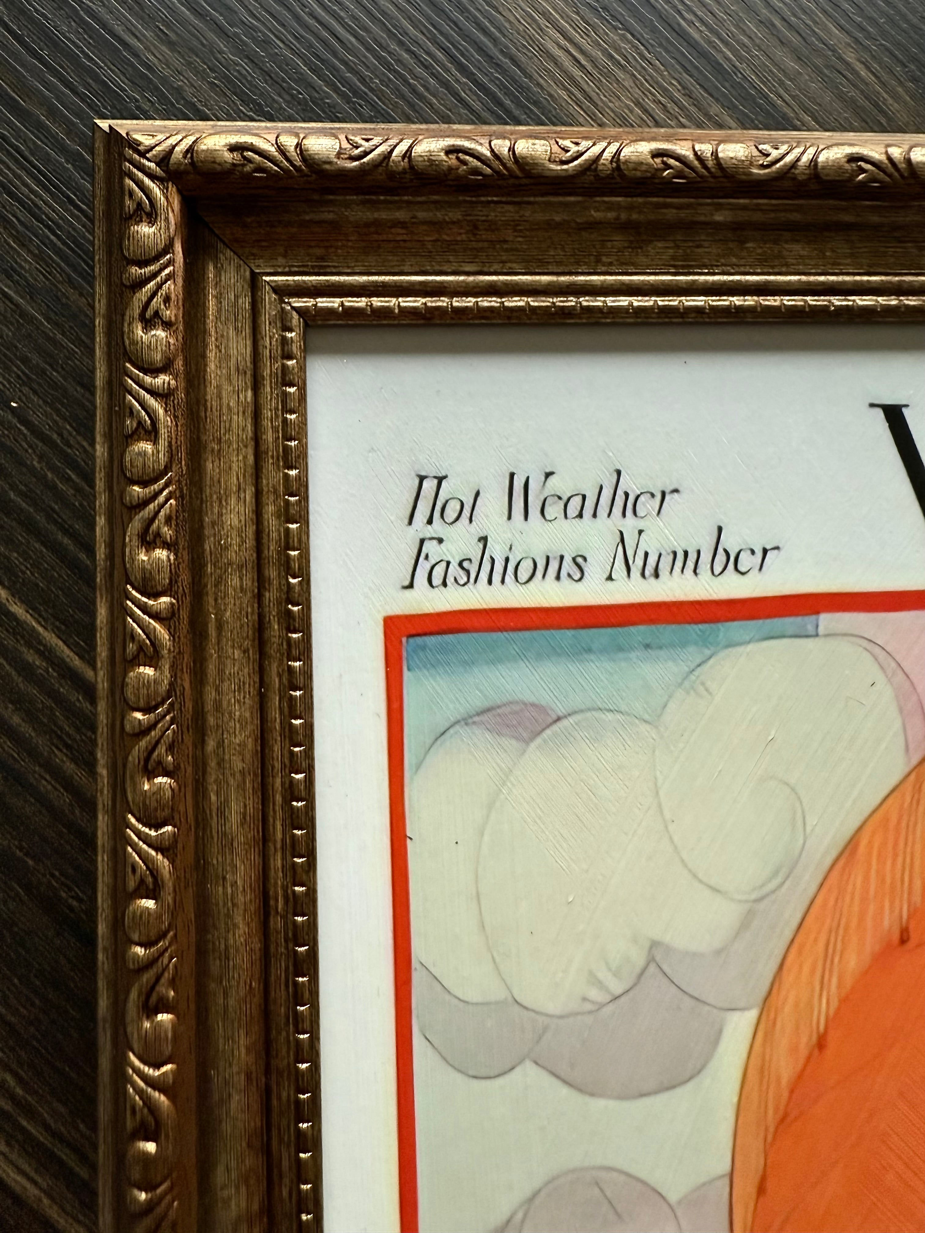 Add timeless seaside elegance to your walls with this beautifully framed reproduction of the Vogue Hot Weather Fashions cover from July 1919. The iconic Art Deco illustration depicts a poised woman standing at the edge of the sea, holding a vibrant parasol as stylized waves ripple beneath her feet. Her elongated silhouette, sculptural pose, and refined expression perfectly capture the glamour and optimism of early 20th-century fashion illustration.
