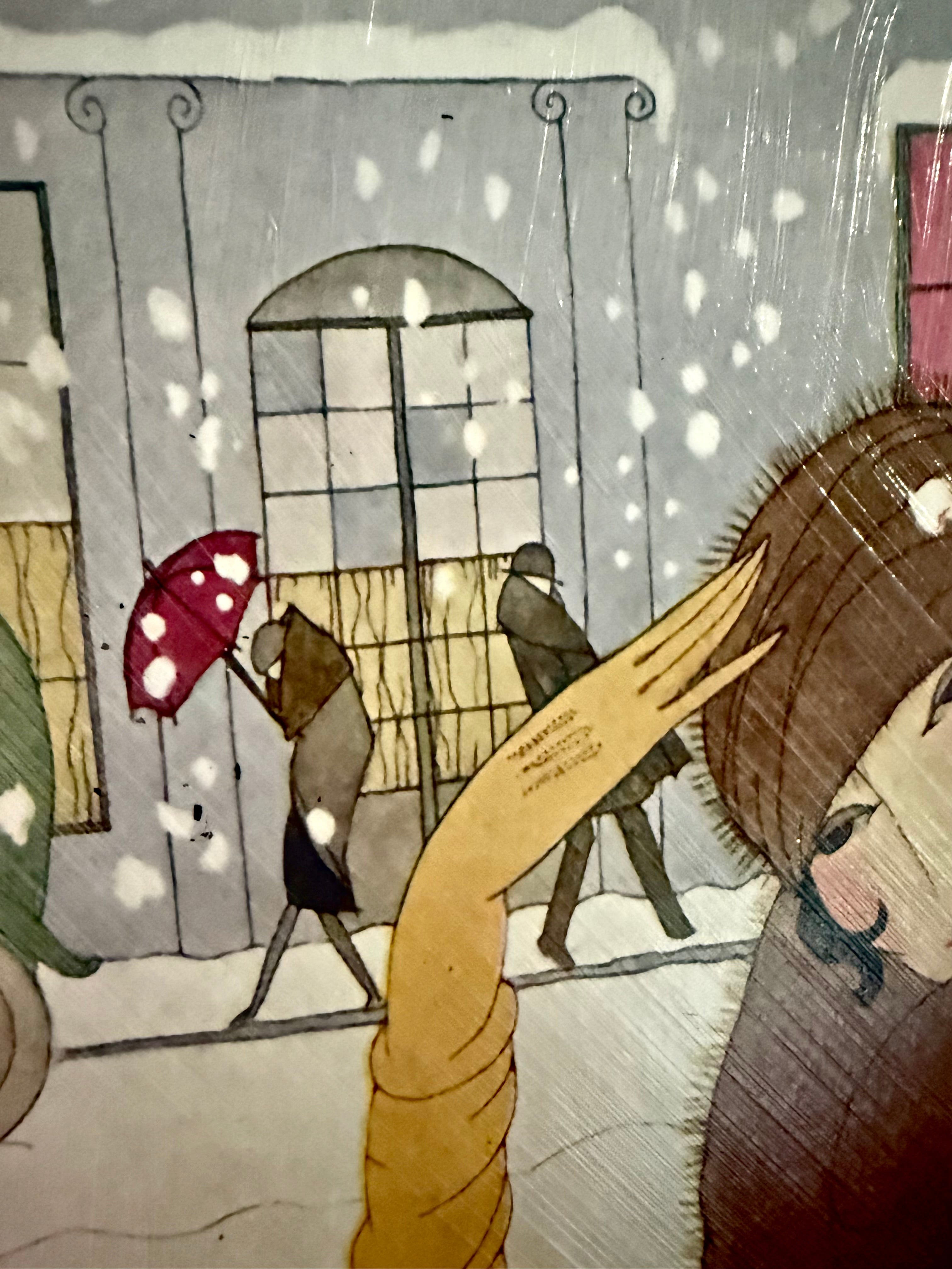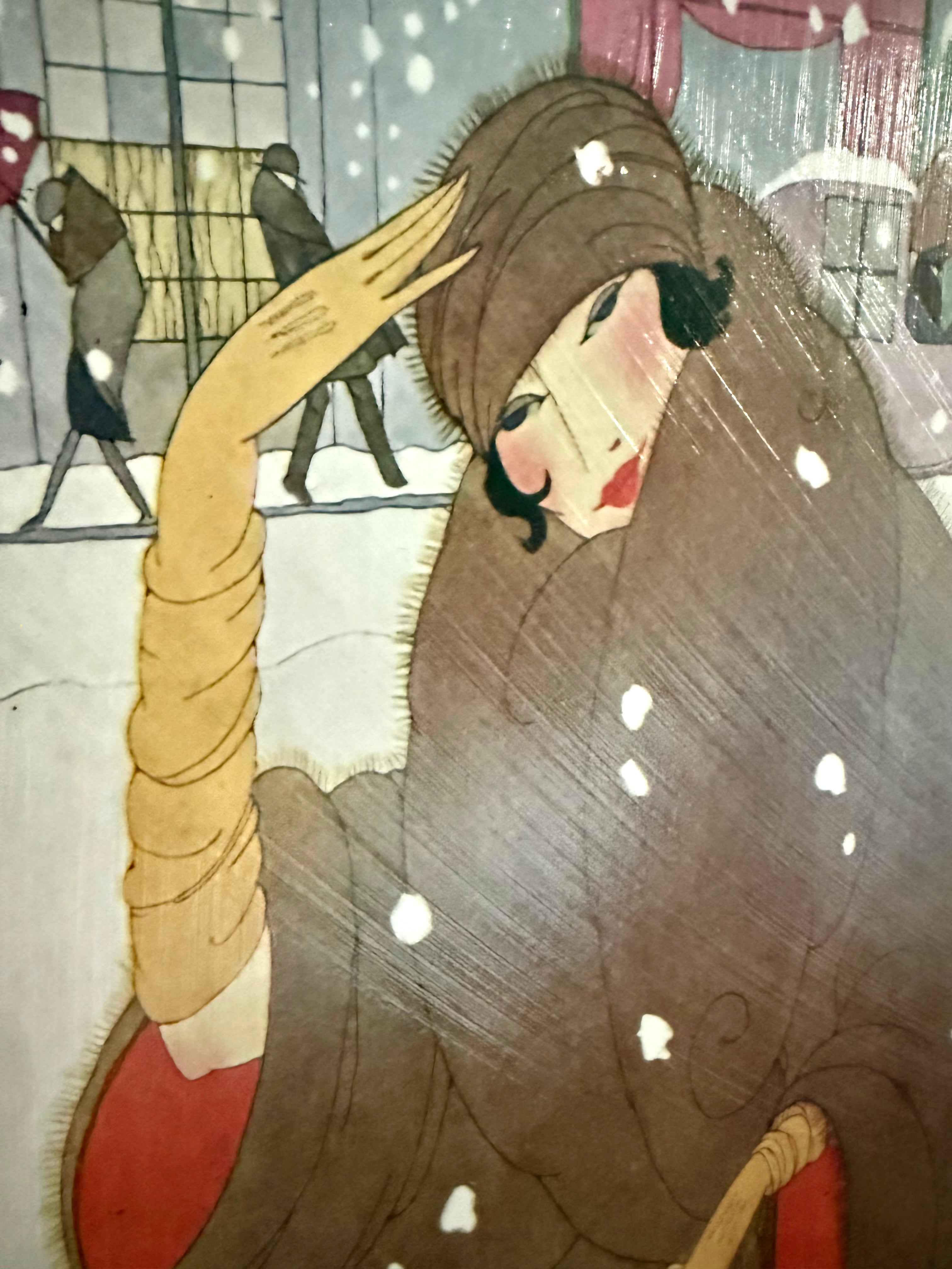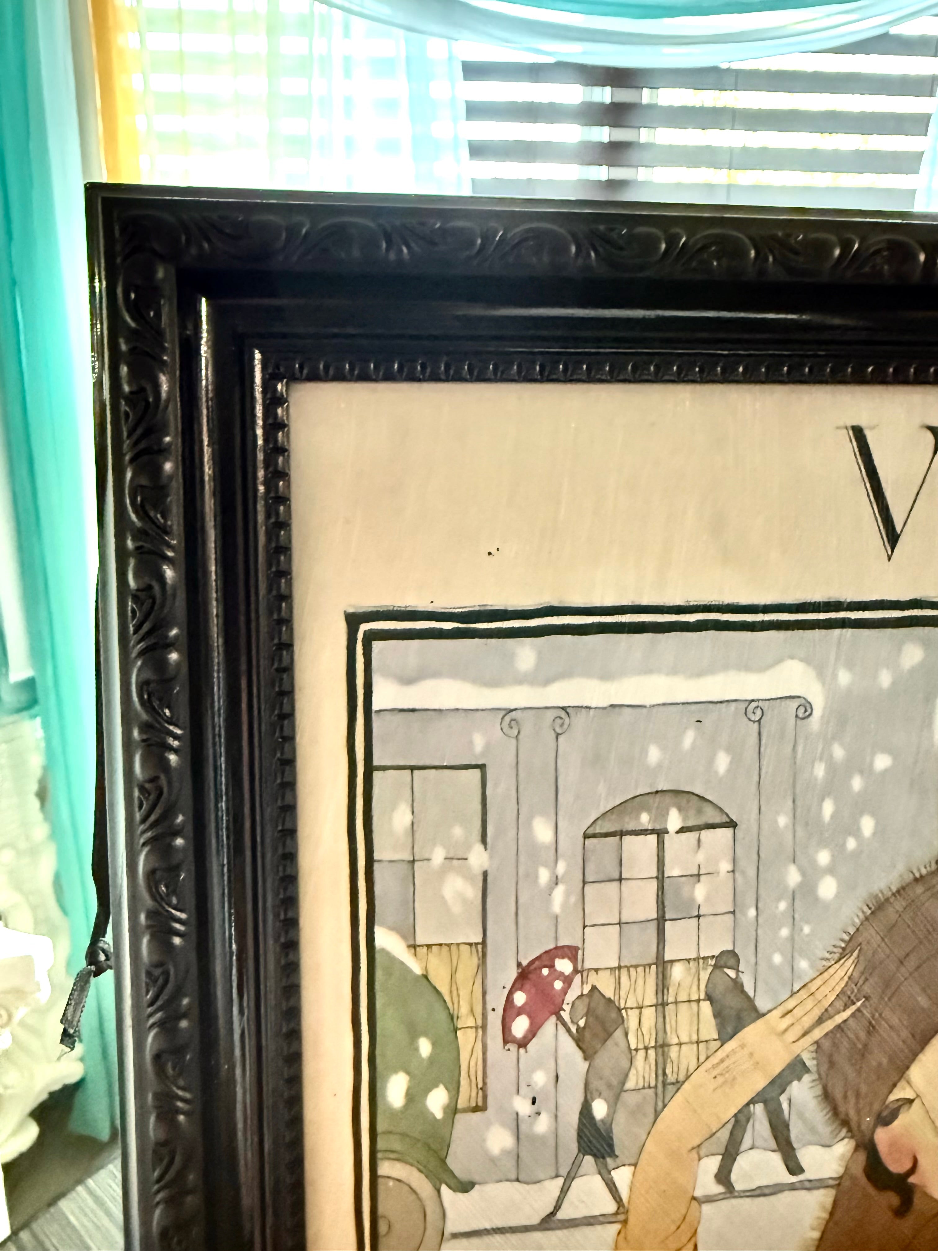 Beautiful framed reproduction of the Vogue “Winter Fashions” cover, November 1920, after illustrator Georges Lepape. The artwork shows an elegant woman wrapped in a sweeping brown coat, walking through a snowy city street with colorful cars and umbrellas in the background. The print has a subtle canvas-like texture and a clear brushed finish, giving it a soft sheen and vintage look that mimics an aged magazine cover. The piece is set in a black ornate frame with raised scroll detailing and a beaded inner edge, adding a sophisticated contrast to the soft winter palette. Perfect for a dressing room, entryway, closet, or Parisian-inspired gallery wall—especially during the holiday and winter season. Details: • Type: Textured reproduction art print • Frame: Molded wood/composite with antique gold finish • Display: Ready to hang wall art • Style: Art Deco, vintage fashion, Hollywood Regency Condition: Brand New! Print surface has a few tiny specks (see close-up photos). No major damage. Approximate Measurements: 15"x1"x24" |