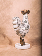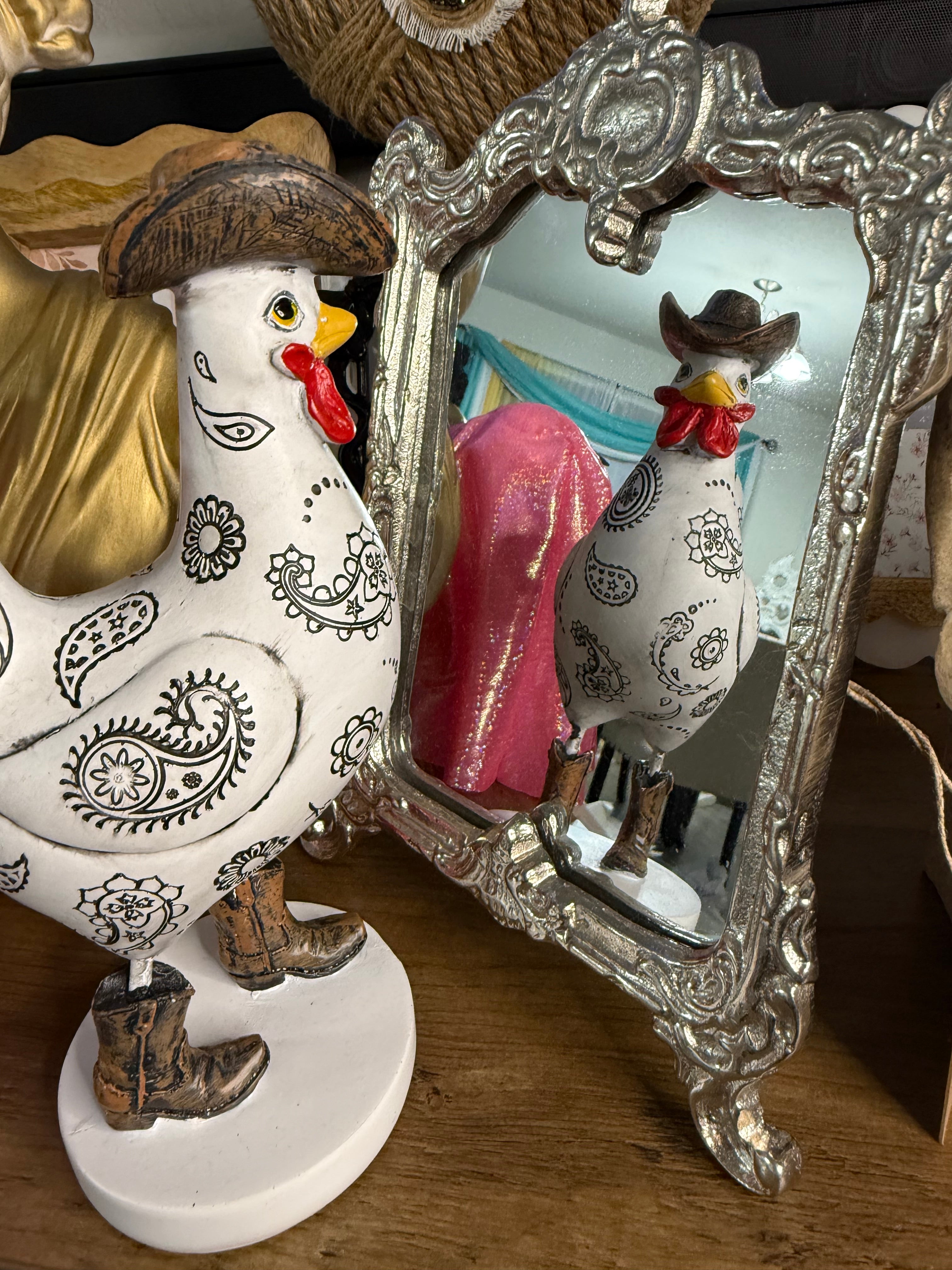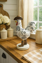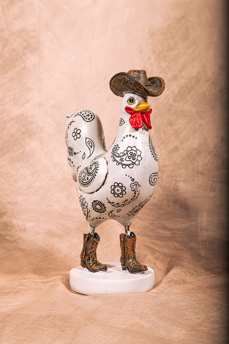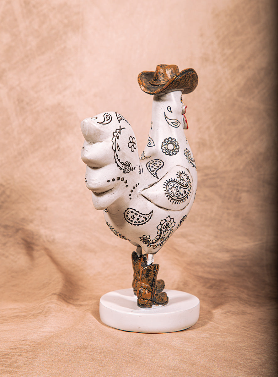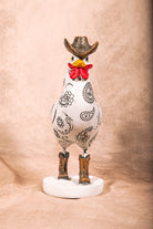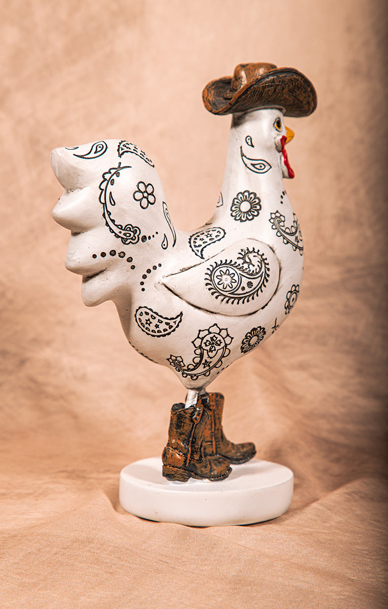 Add a dose of personality to your home with this White Western Rooster Figurine — a playful nod to rustic Americana. Hand-painted with intricate black paisley patterns and dressed in a cowboy hat and boots, this resin rooster combines farmhouse charm with whimsical character.