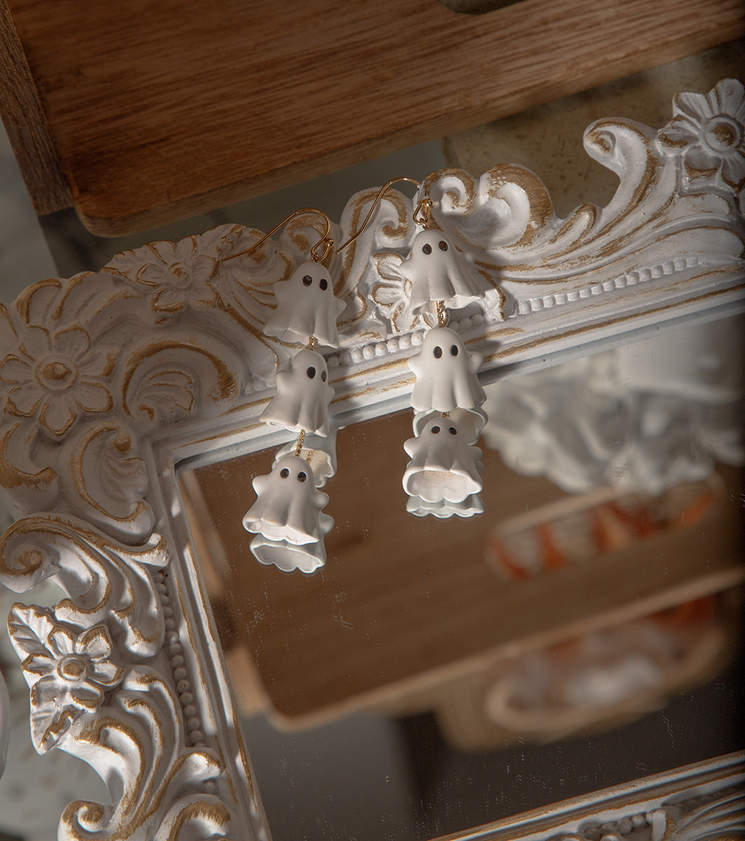 The product is a pair of Halloween-themed dangling earrings in a vintage style. The earrings are adorned with ghost motifs, giving them a whimsical and spooky vibe perfect for the Halloween season. It adds a touch of elegance and sophistication to the overall design. These earrings are a fun and stylish accessory for those looking to add a bit of Halloween flair to their outfit.