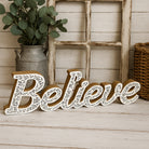 Fill your space with hope and positivity with this elegant “Believe” wooden word sign. Crafted with a delicate lace-cut floral design and a warm neutral tone, this decorative piece serves as a daily reminder to have faith — in yourself, in your dreams, and in life’s unfolding journey.