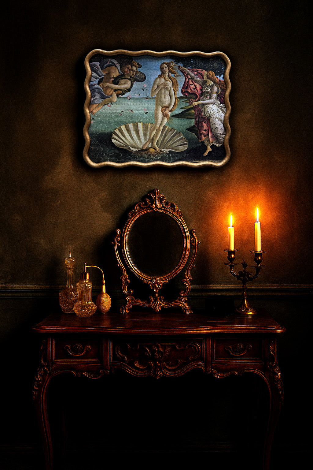 A romantic flourish for your walls: this vintage Florentine plaque showcases Botticelli’s Birth of Venus nestled in a gilded, scalloped frame. The image is sealed beneath varnish, creating that coveted time-softened crackle and gentle sheen that collectors adore. Style it above a vanity, in a Rococo vignette, or to bring a whisper of Italian grandeur to modern spaces. Expect beautiful patina—fine surface craquelure. A charming statement for lovers of classical art and Hollywood Regency glamour.