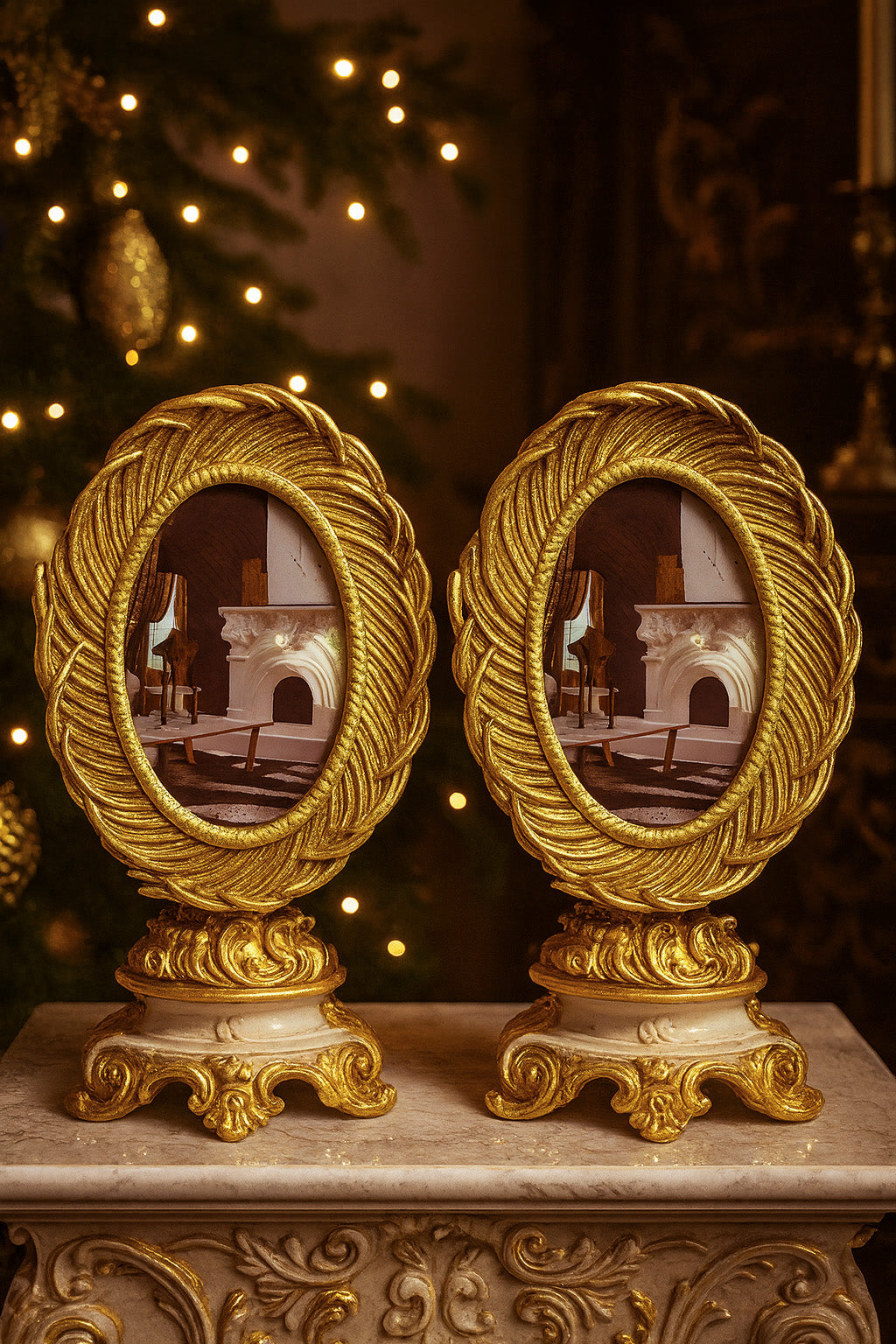Offered as an elegant pair, these gilded baroque oval frames bring timeless luxury to any interior. Each frame features a sculpted feather-leaf design finished in rich antique gold, catching the light with a warm, opulent glow. The ornate pedestal bases create a sense of height and drama, making the set ideal for styling on vanities, mantels, bookshelves, or curated holiday displays.