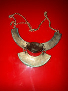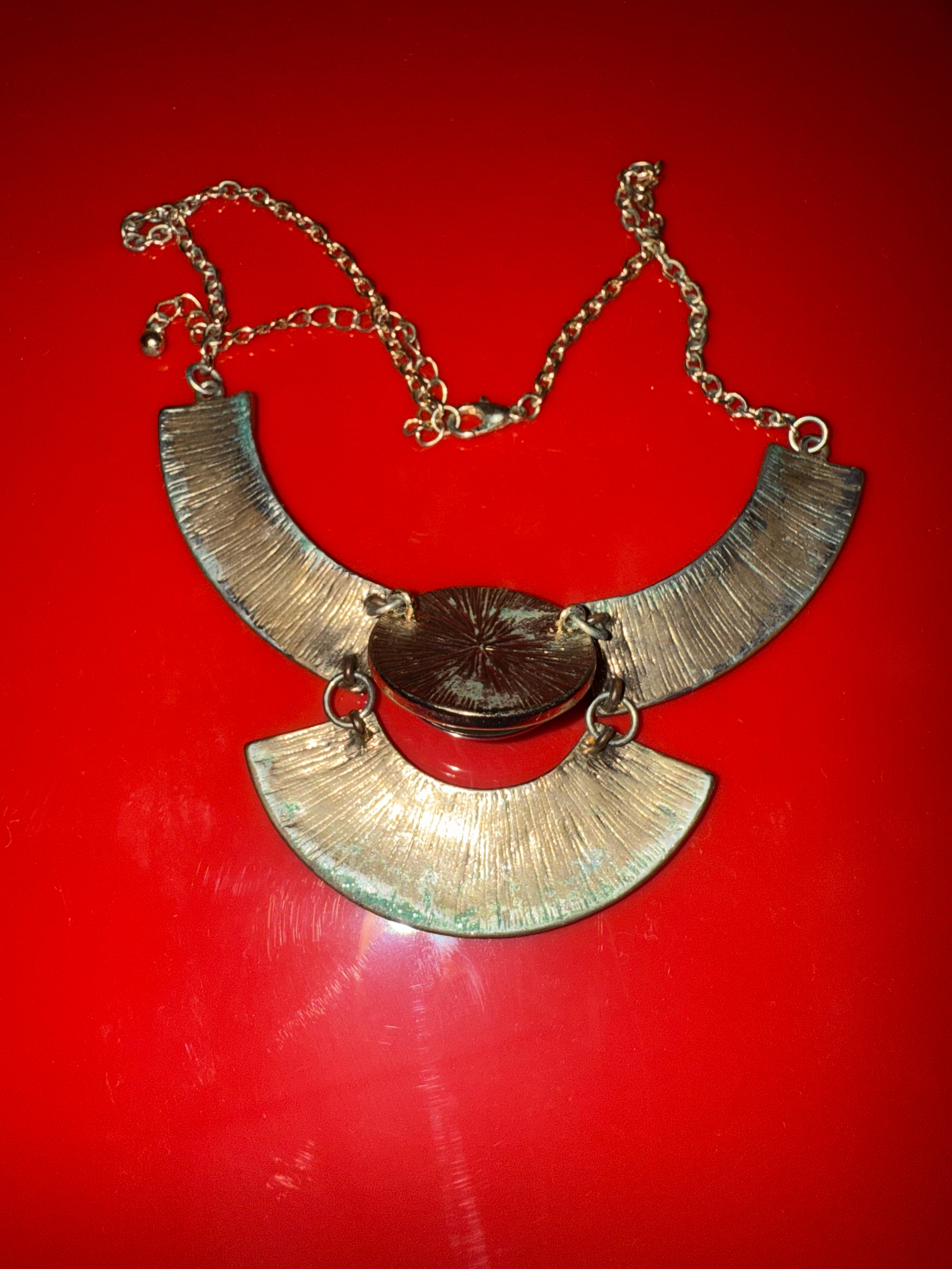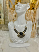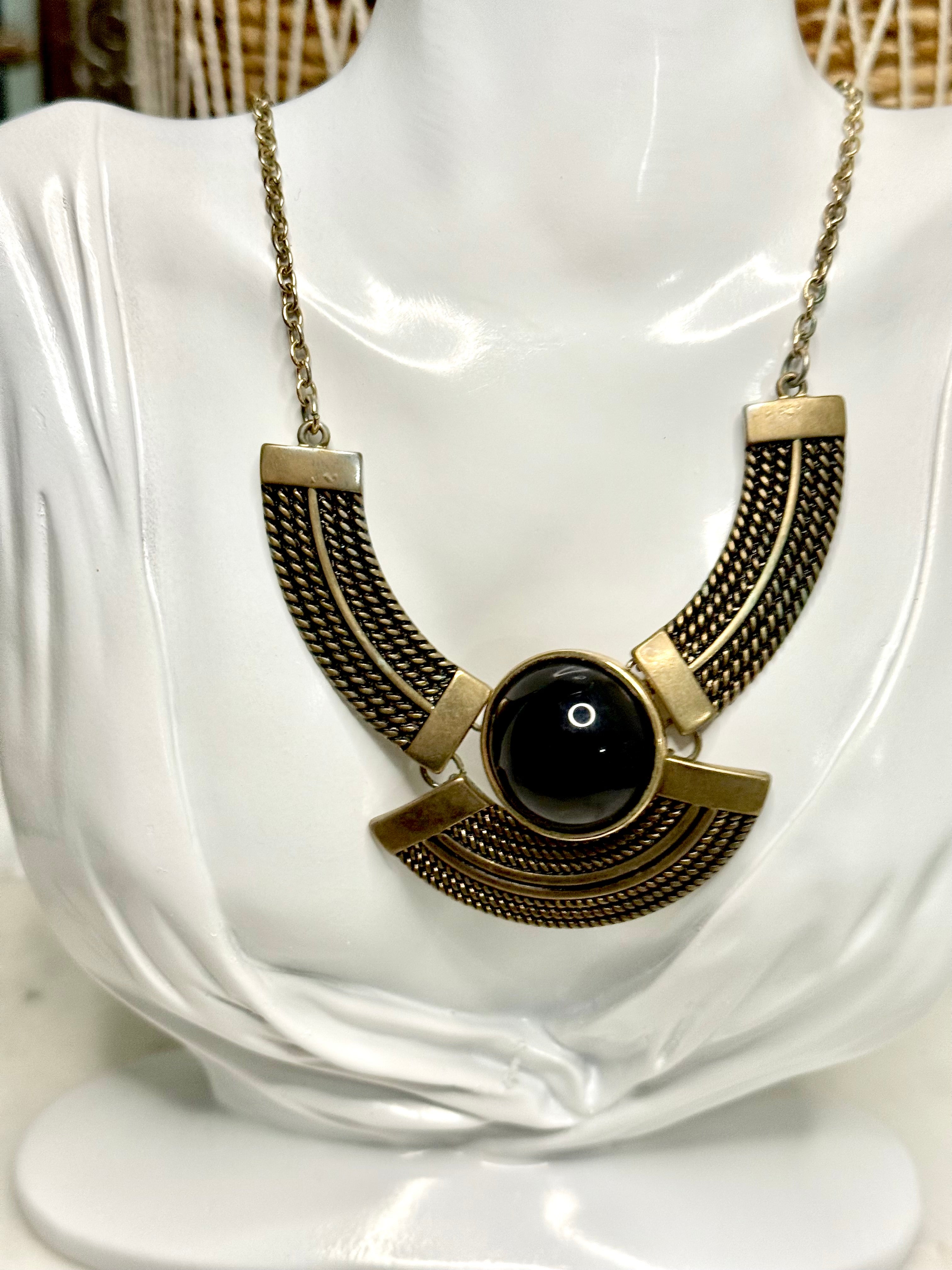 Channel ancient elegance with this Egyptian-style Cleopatra necklace, designed in matte gold with a bold black gemstone centerpiece. The sculptural shape and mesh texture evoke royal grandeur, making it the perfect statement piece for evening wear, costume styling, or museum-inspired fashion.