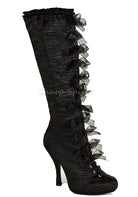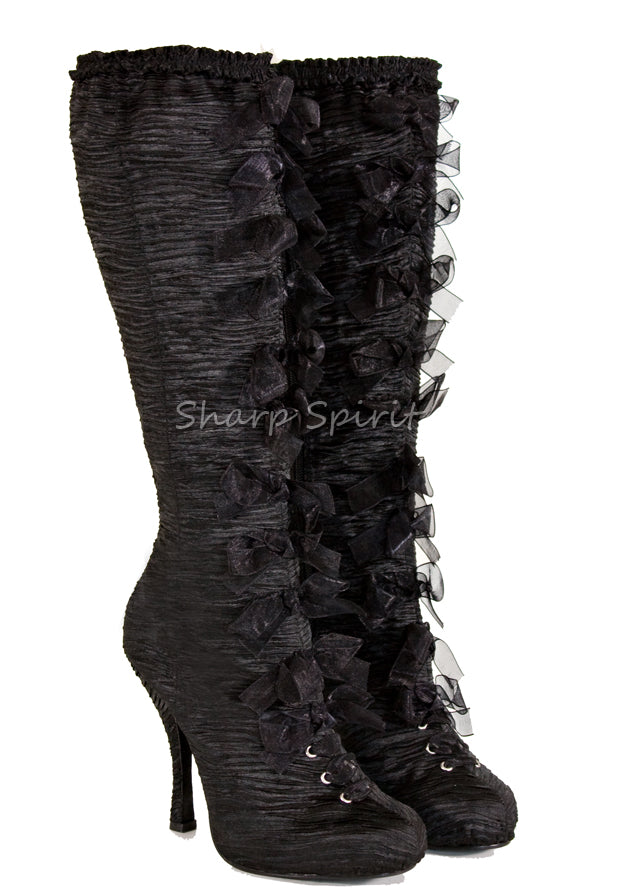 Knee high boots with inner side zipper and decorate bows. A theatrical flourish of ruching and ribbon. These lace-trimmed knee-high boots rise on a 5-inch heel, tied with bows and brimming with Victorian-gothic fantasy. Made for statement wear, cosplay, or dark couture ensembles.