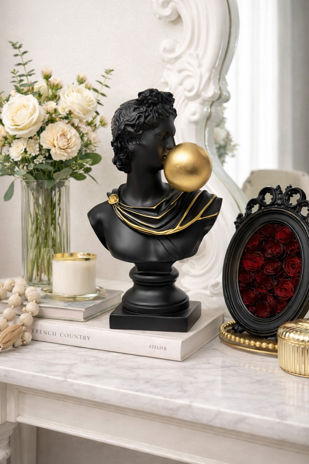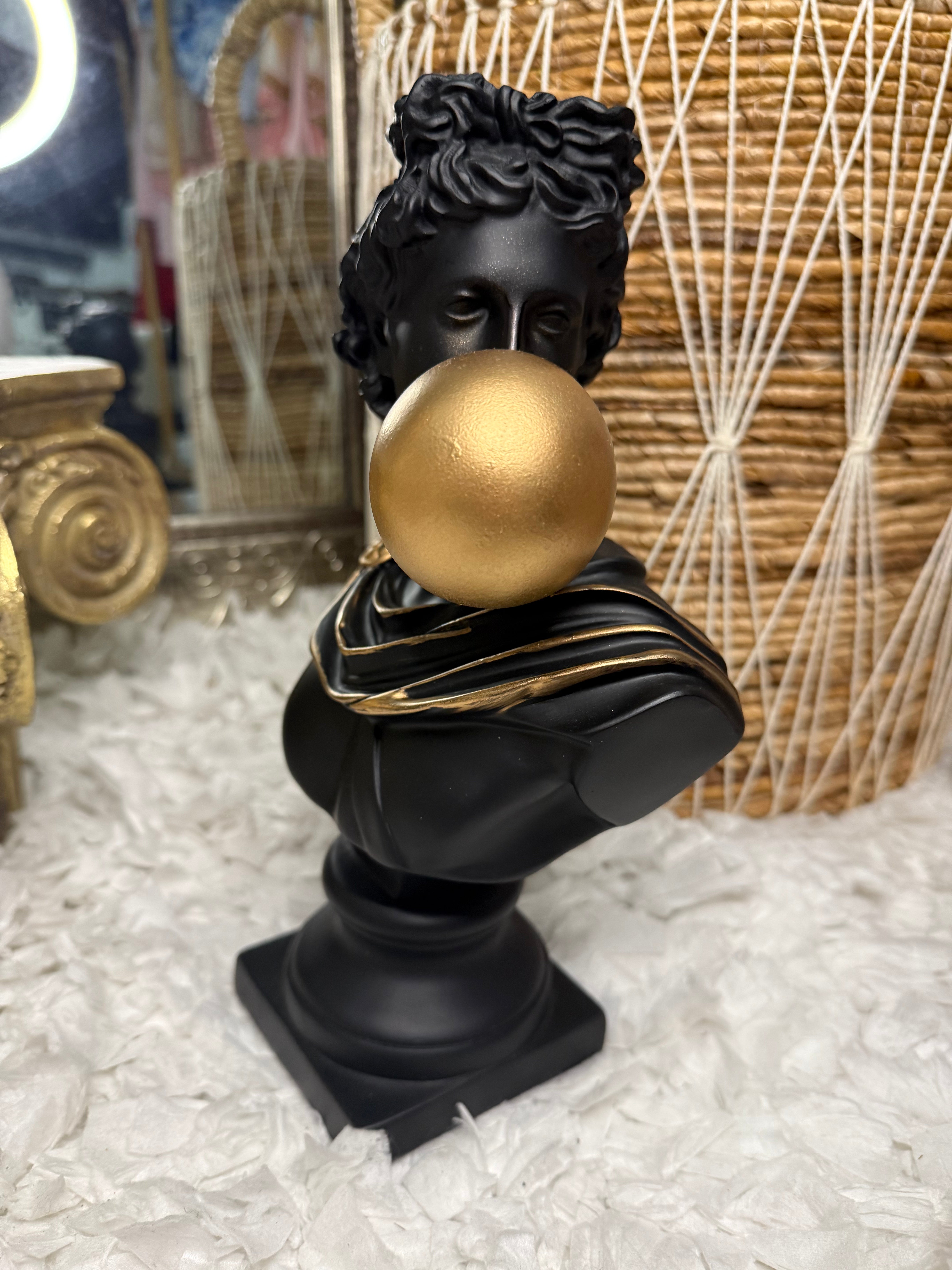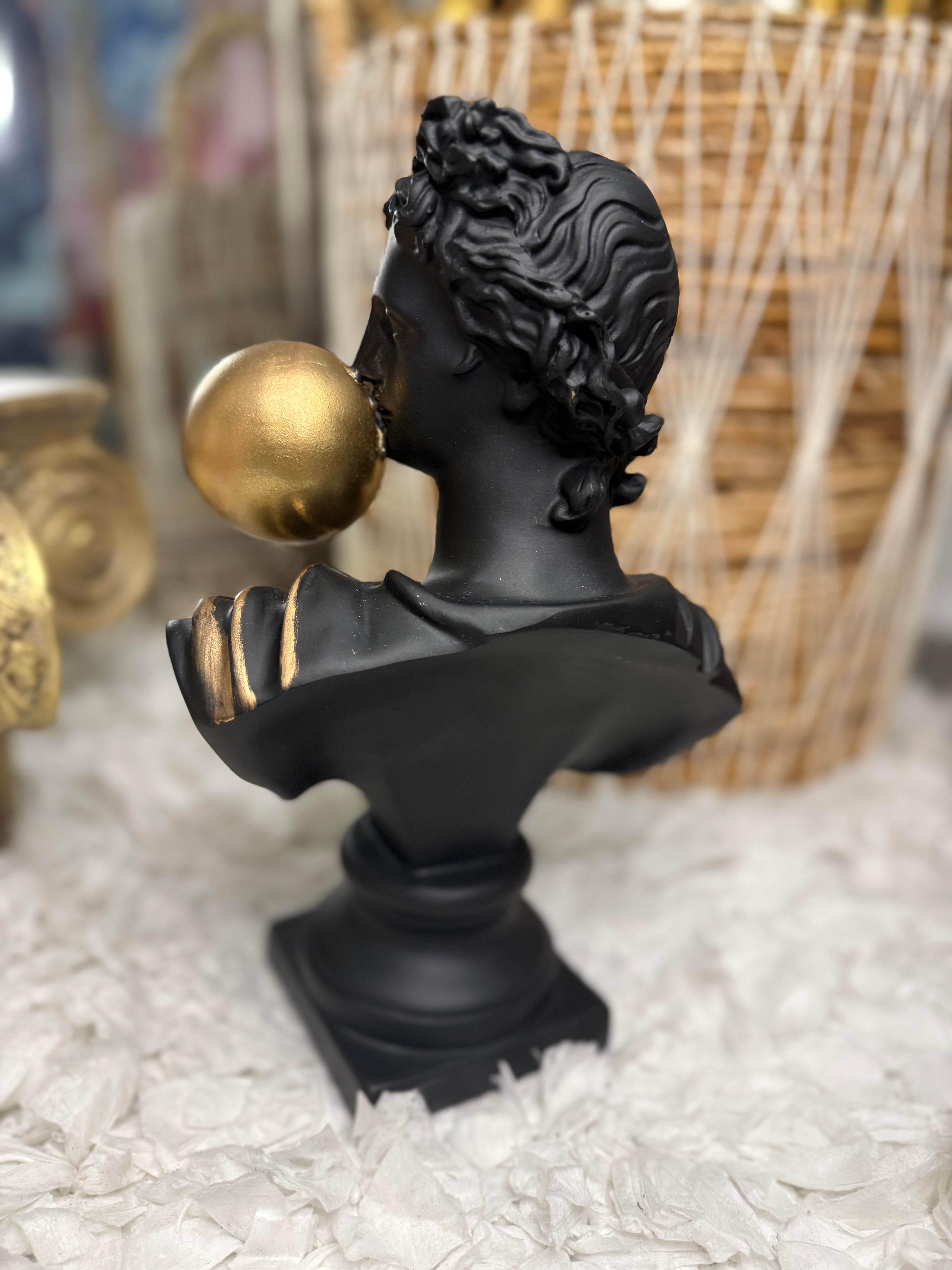Add a touch of surreal elegance to your space with this striking black Apollo bust blowing a gold bubblegum — a playful fusion of Greek mythology and modern pop art.