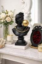 Hand-painted in matte black with a luminous metallic gold accent, this sculptural décor piece transforms any shelf or gallery wall into a statement of bold creativity and classical rebellion.