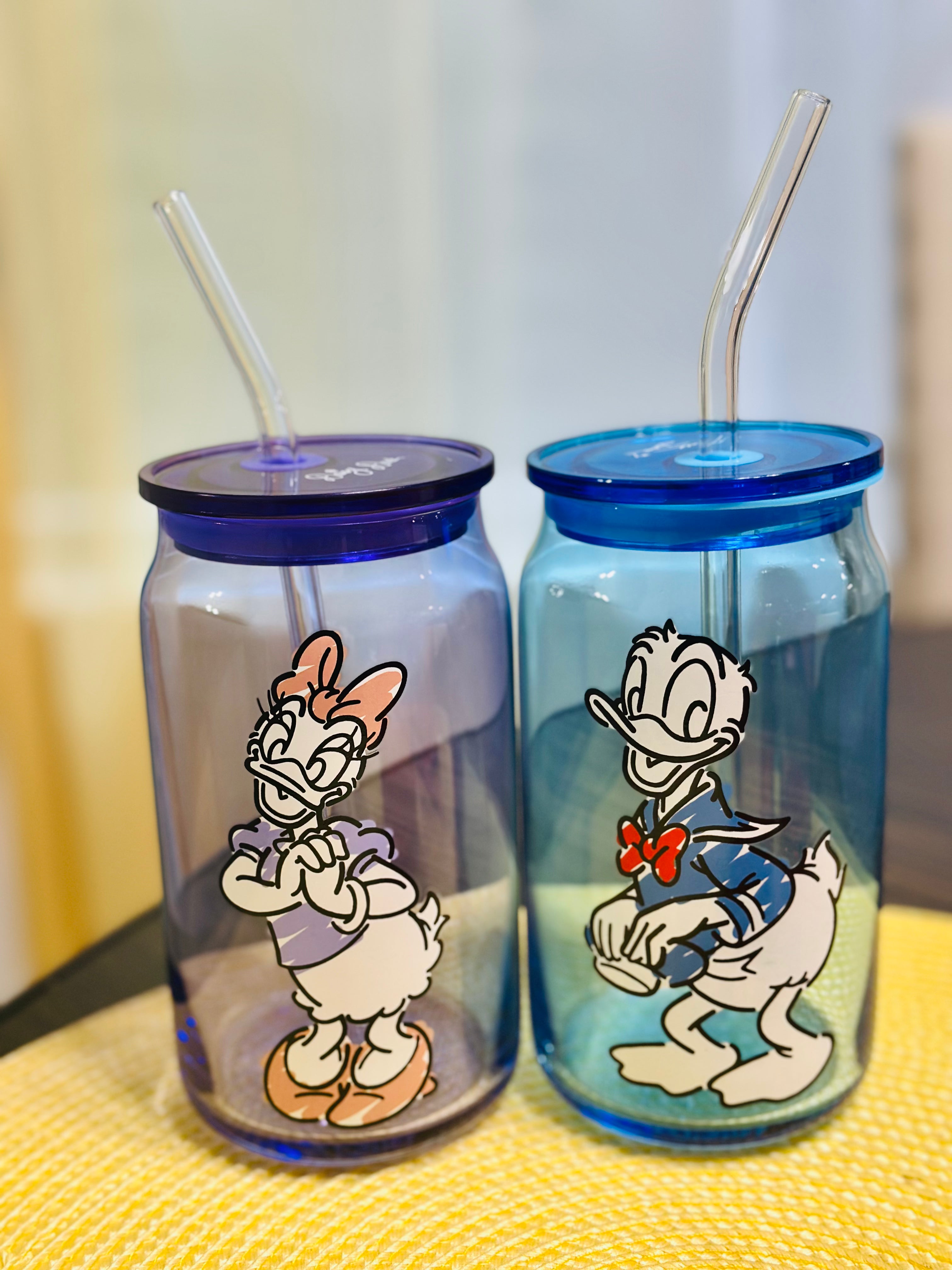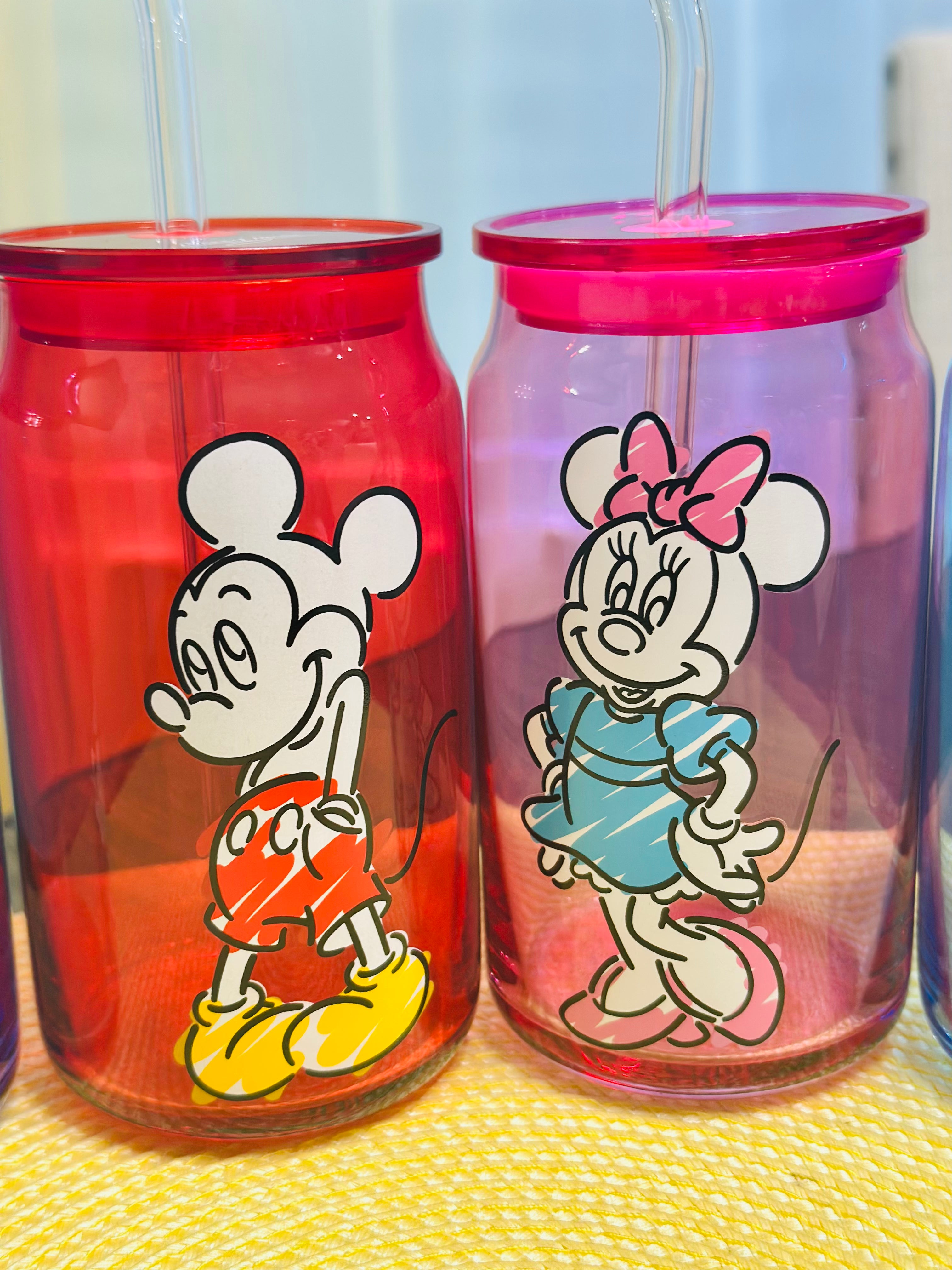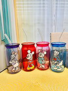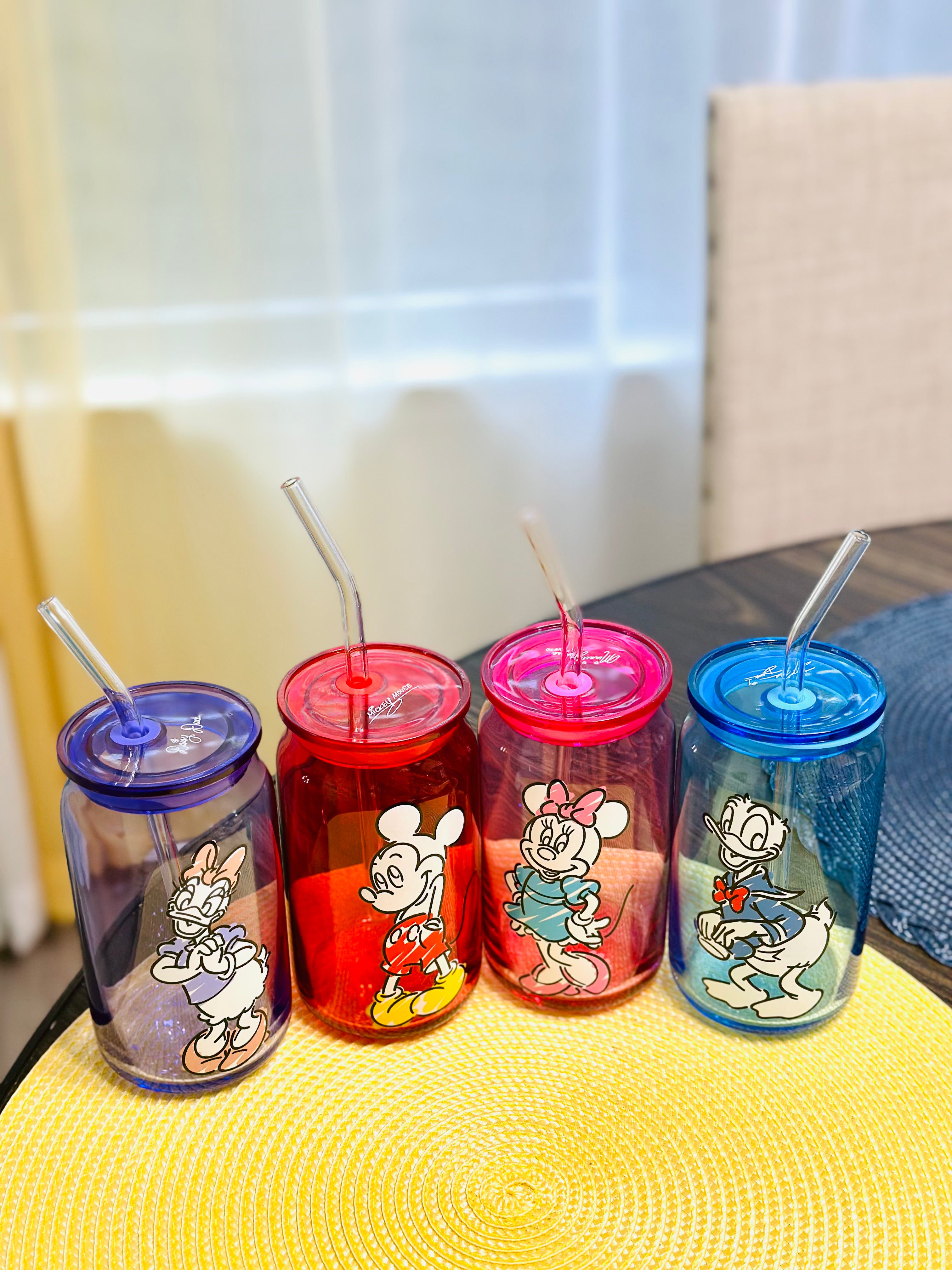 Perfect for everyday use or as a collectible set for Disney fans, these sturdy 16oz glass tumblers include matching plastic lids and reusable straws, making them ideal for smoothies, iced coffee, water, or your favorite beverages. Their playful design adds a cheerful pop of color to any shelf, picnic, or vintage-themed gathering.