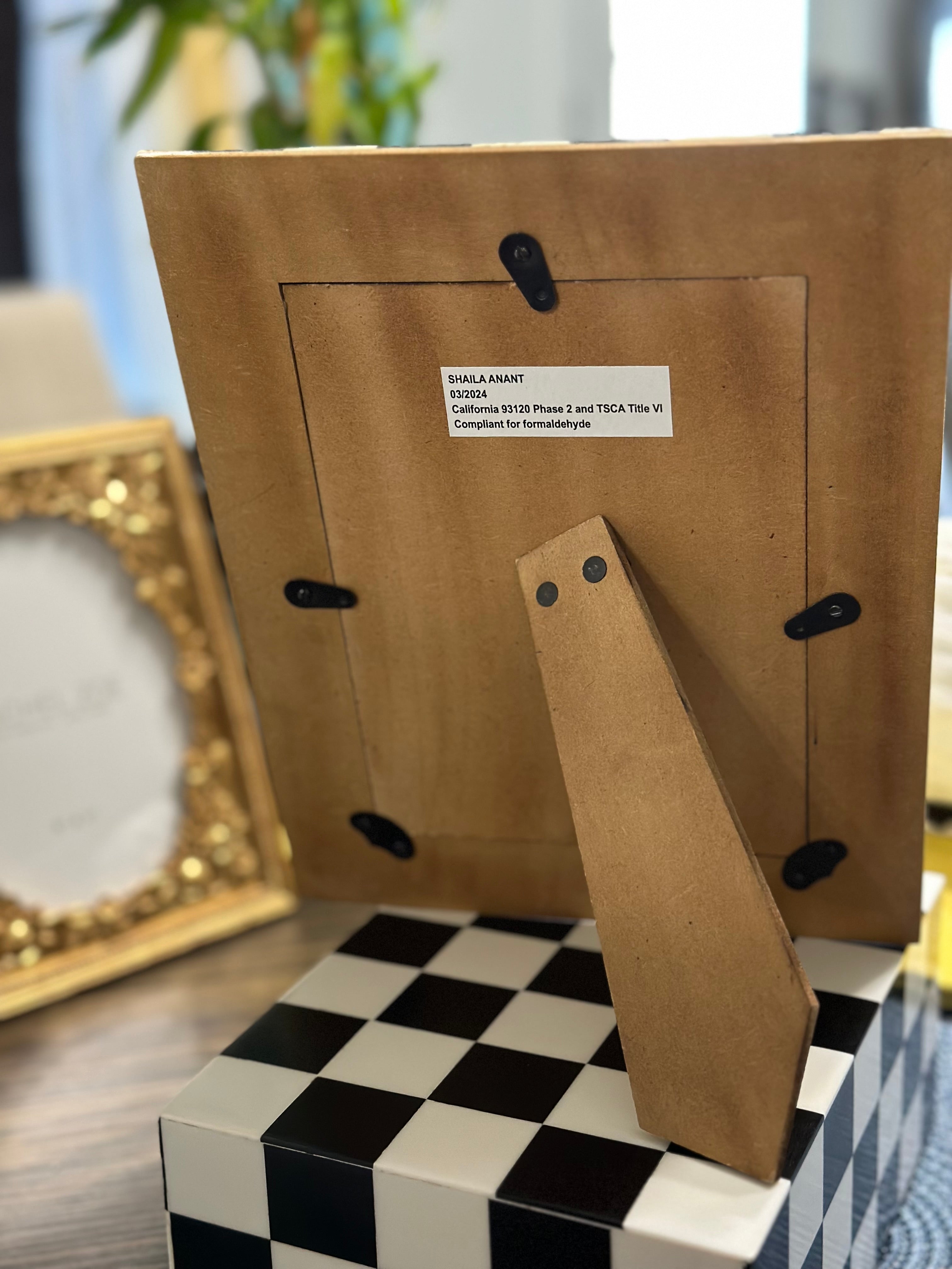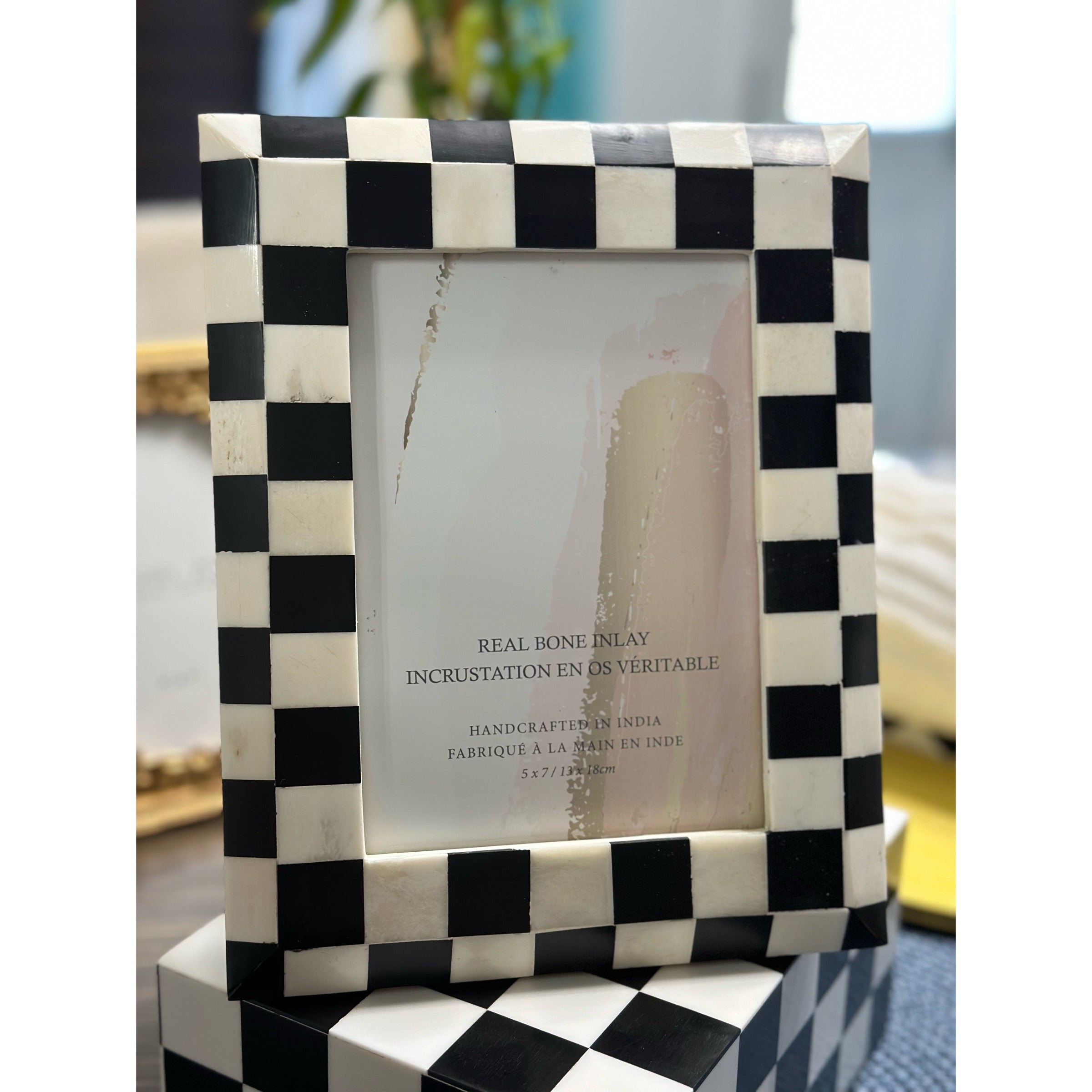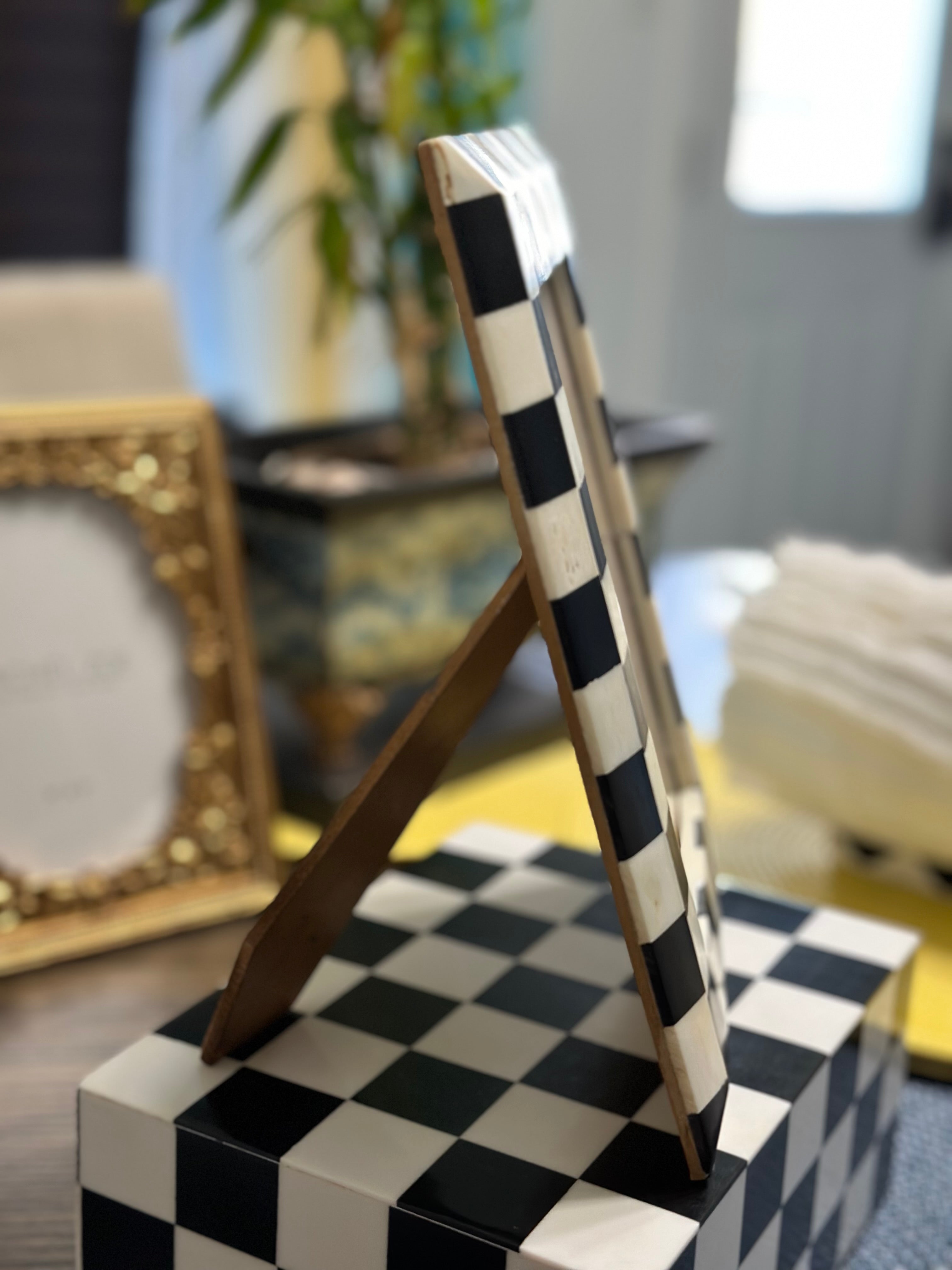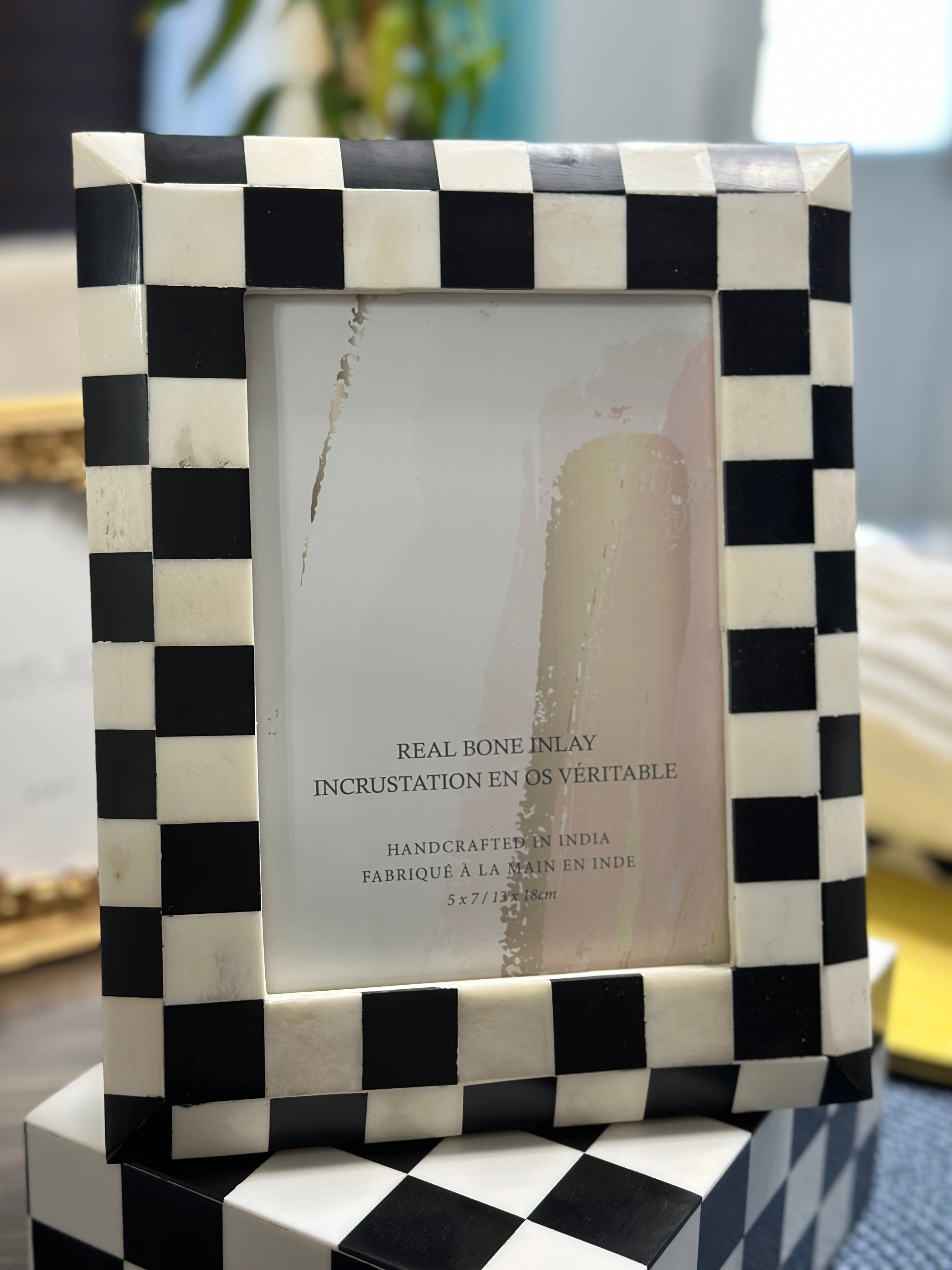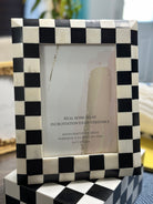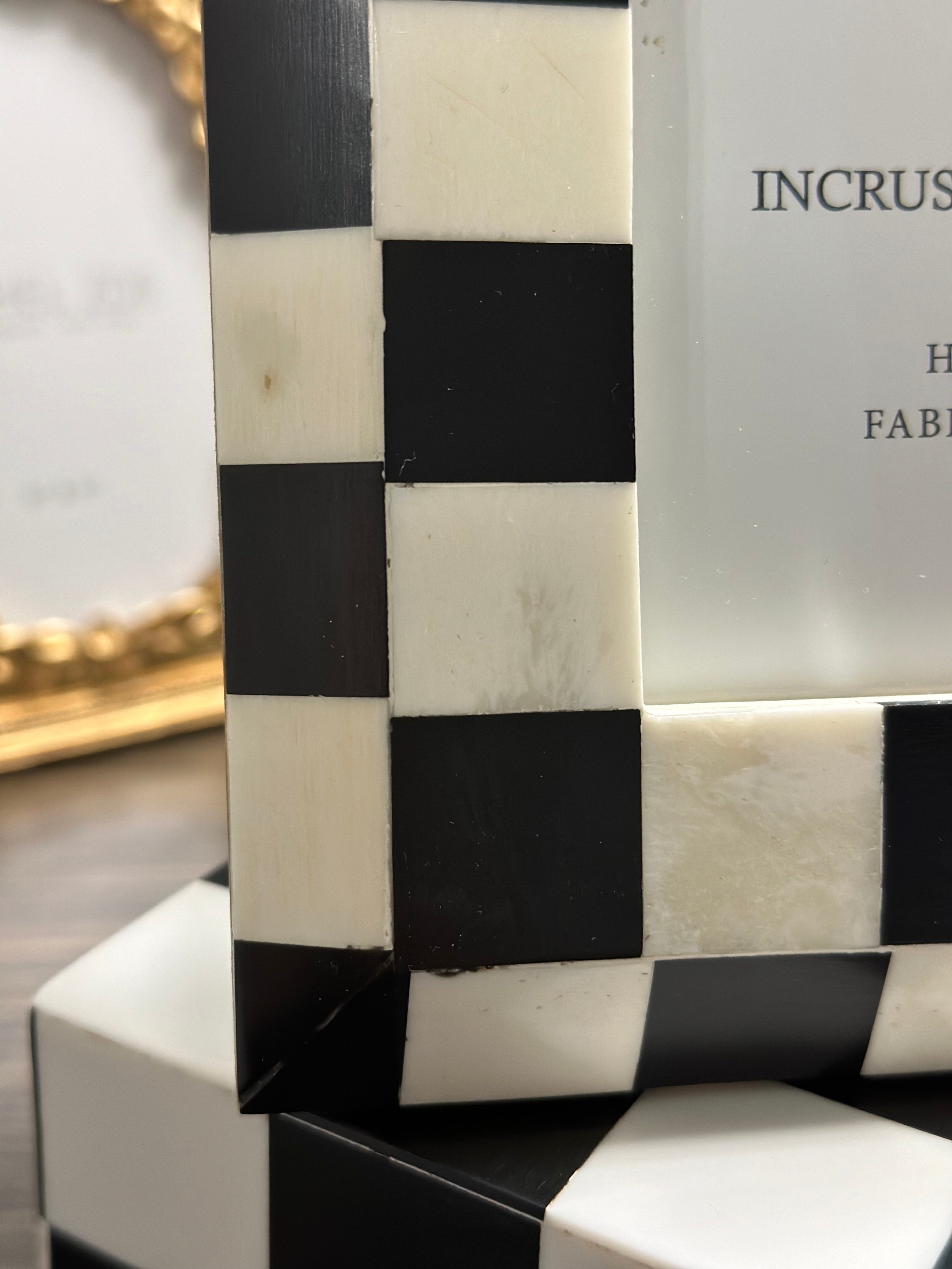 Add a bold artistic accent to your space with this handcrafted bone inlay photo frame, featuring a striking black-and-white checkered pattern. Inspired by mid-century Pop Art and retro design, this piece combines timeless craftsmanship with a playful modern edge.