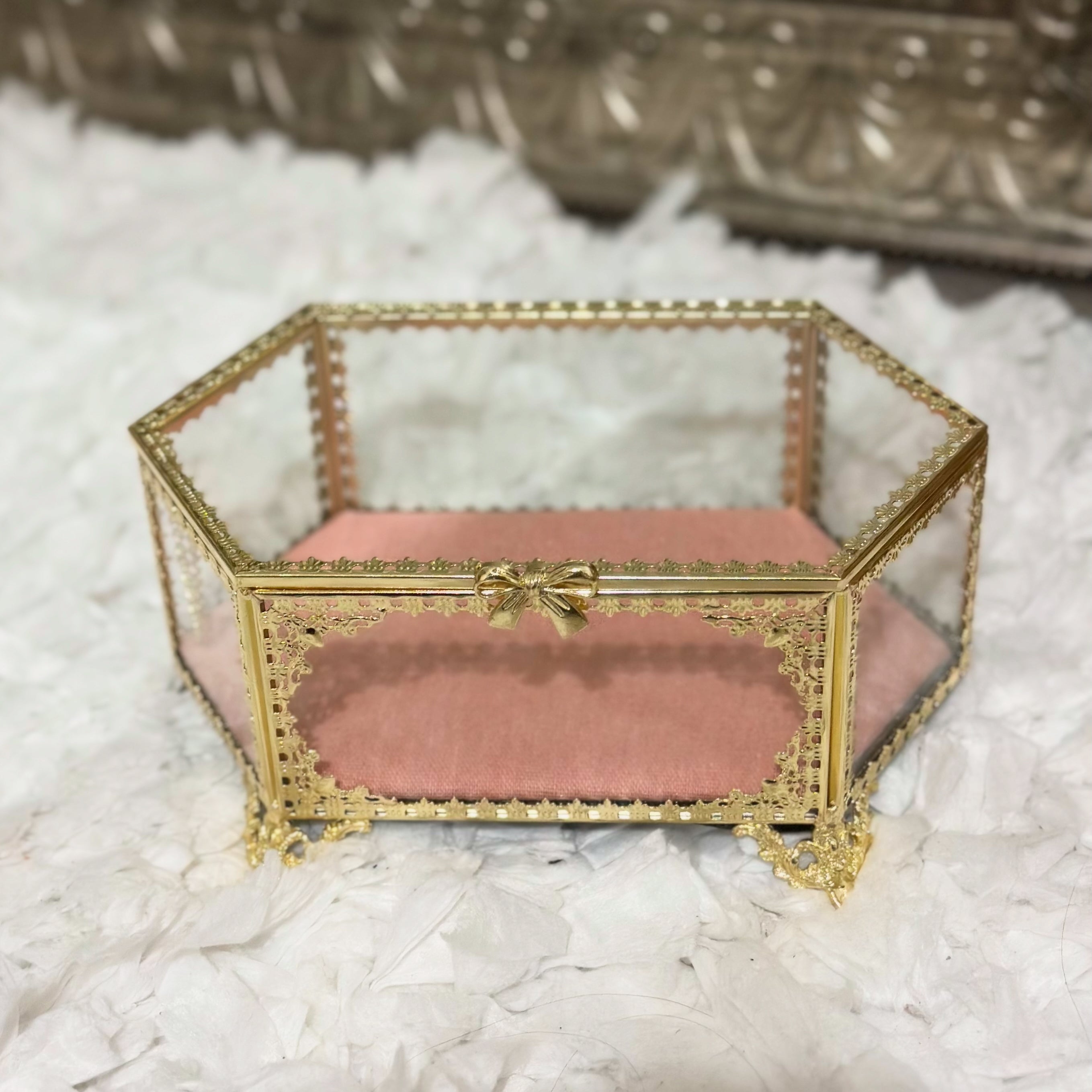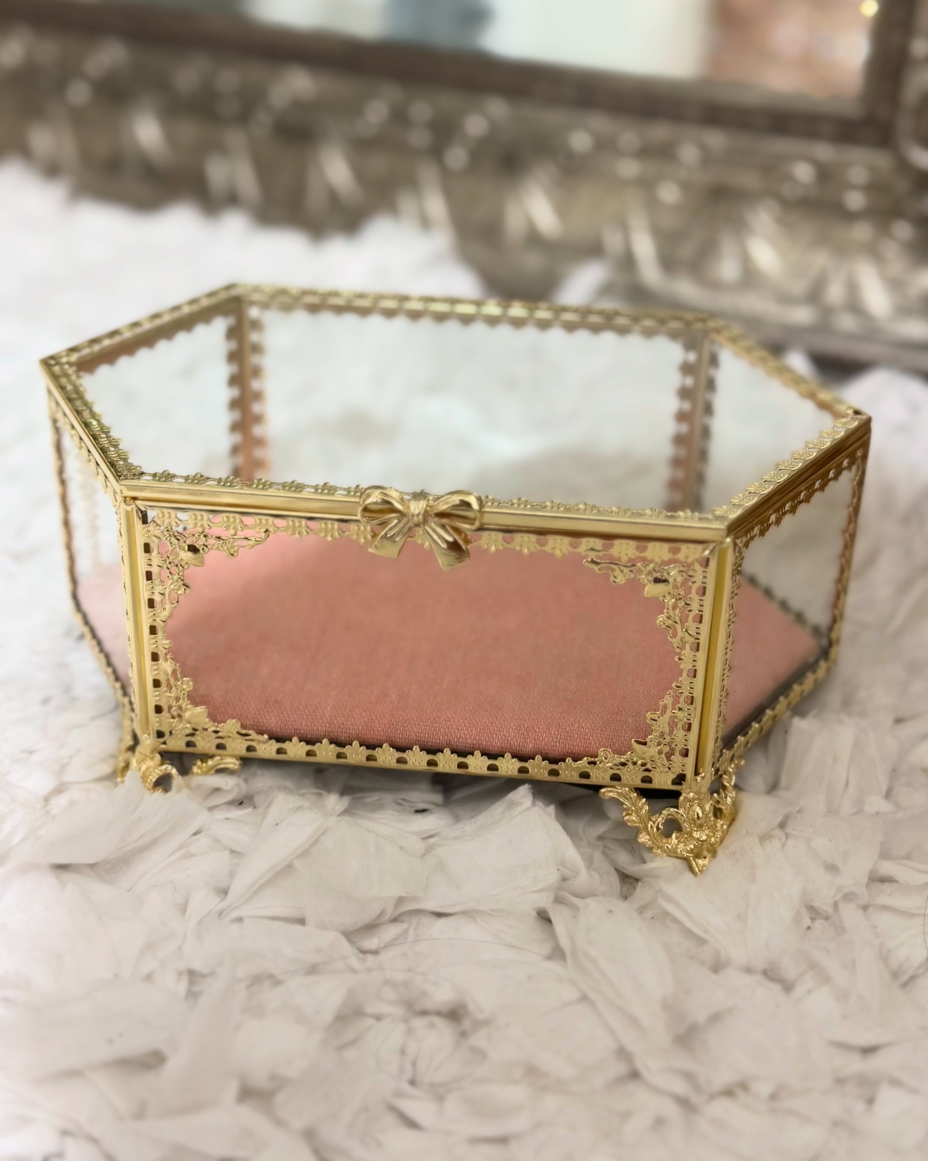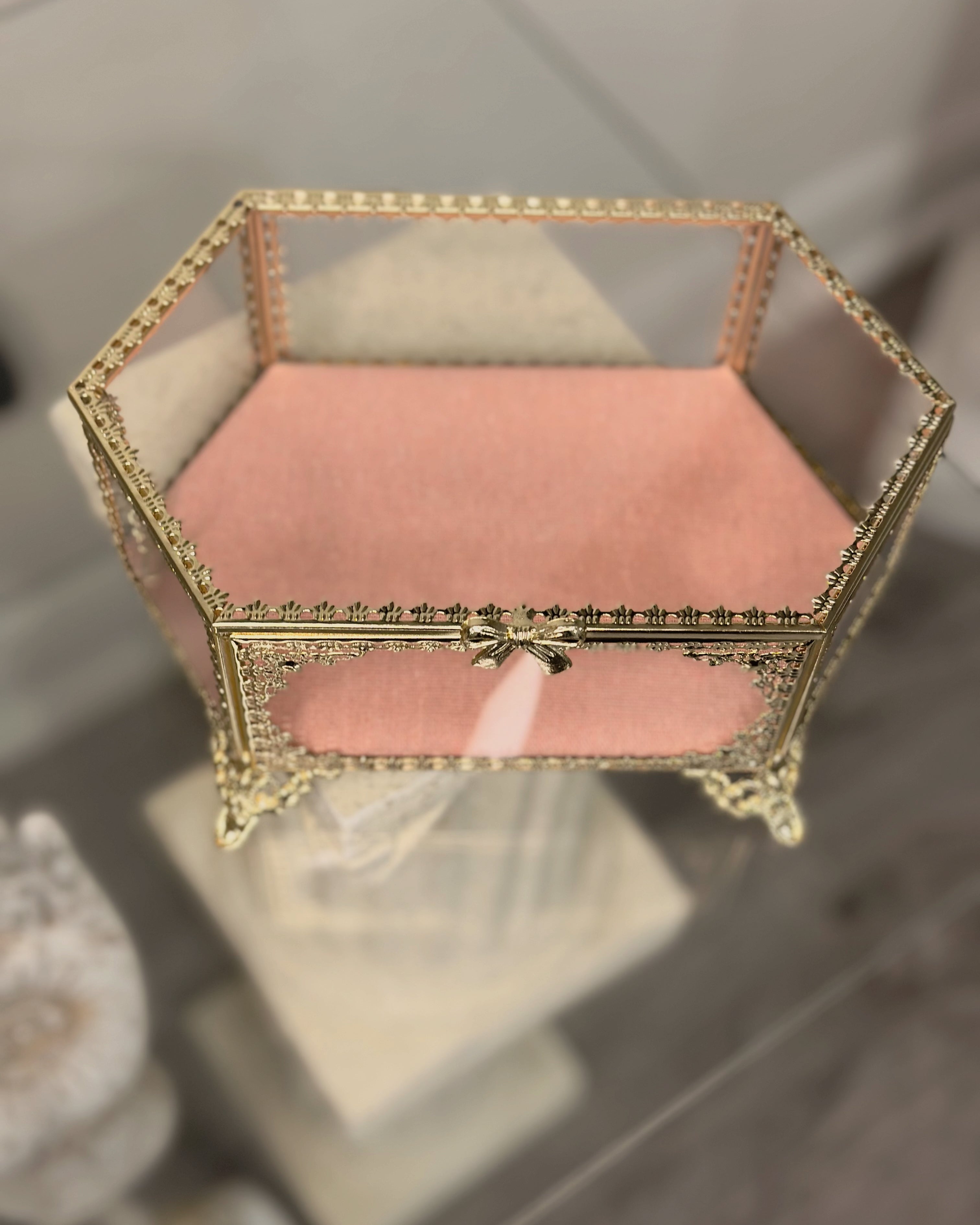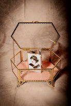 Elevate your vanity with this exquisite vintage-style hexagon jewelry trinket box, delicately crafted with golden bow detailing and a soft blush velvet base. Its intricate filigree frame and beveled glass panels capture the romantic elegance of Victorian and Hollywood Regency décor.