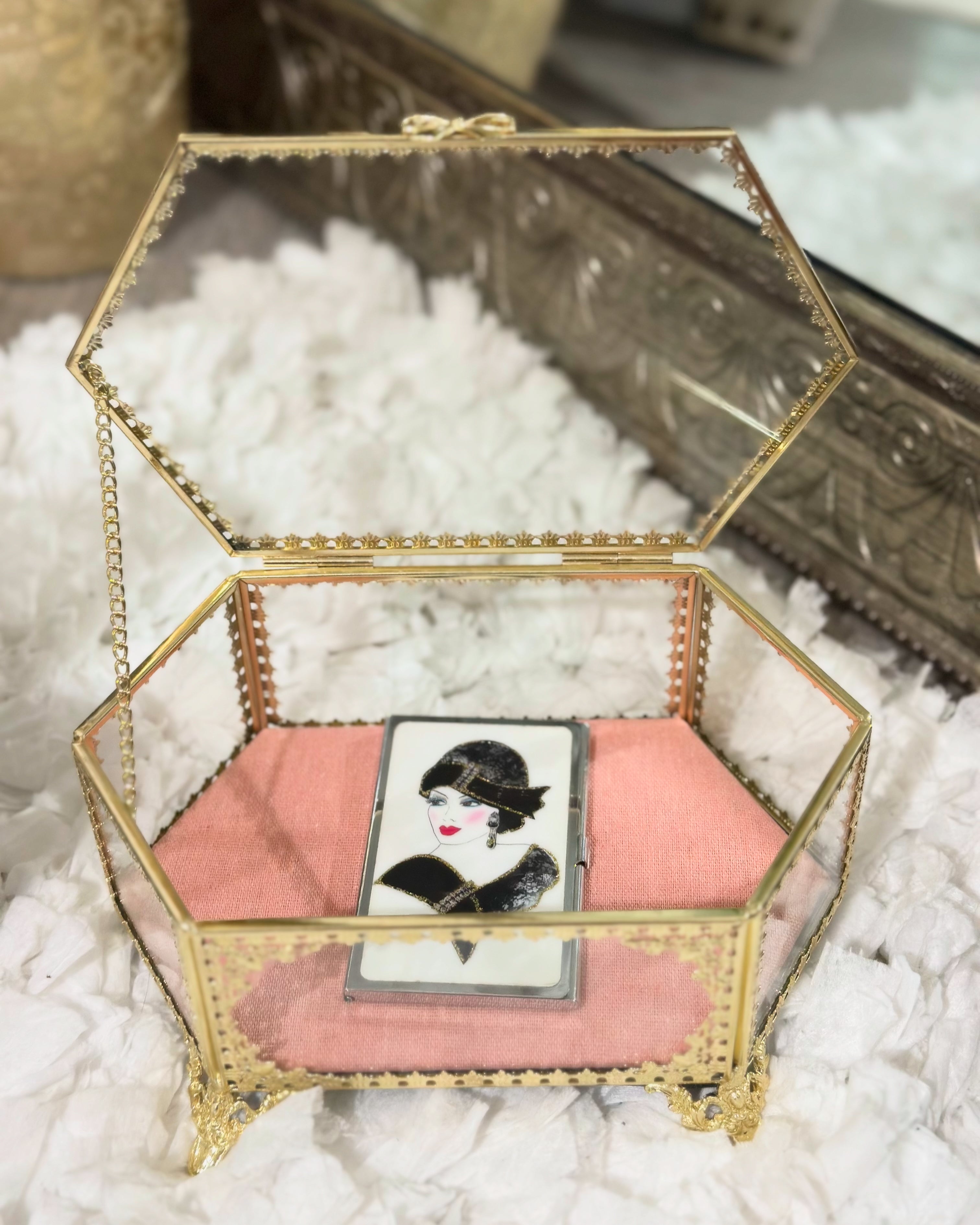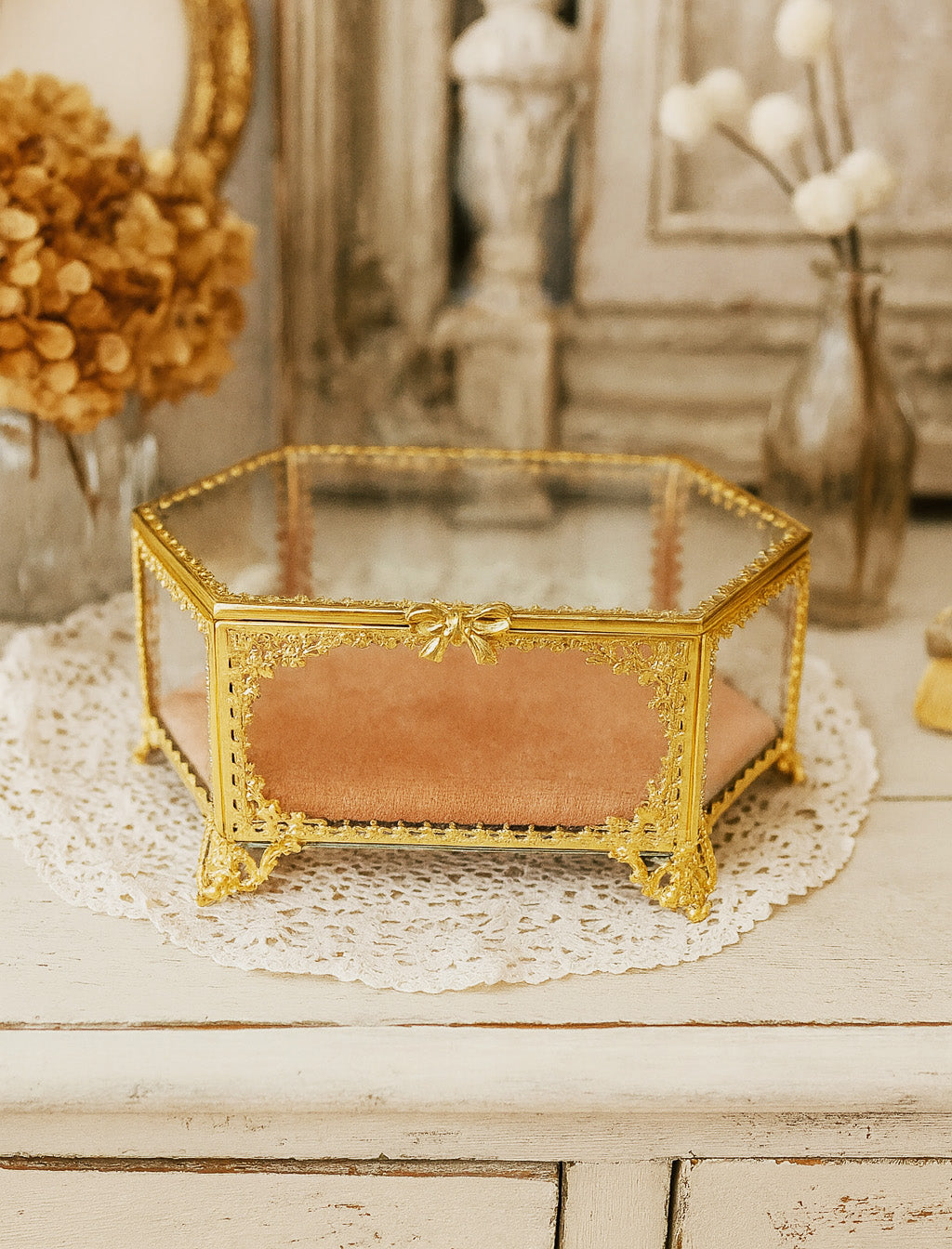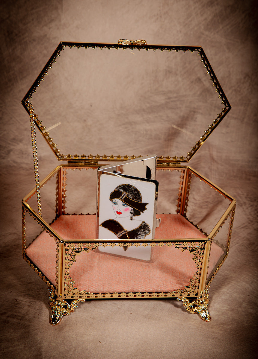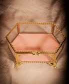 Elevate your vanity with this exquisite vintage-style hexagon jewelry trinket box, delicately crafted with golden bow detailing and a soft blush velvet base. Its intricate filigree frame and beveled glass panels capture the romantic elegance of Victorian and Hollywood Regency décor.