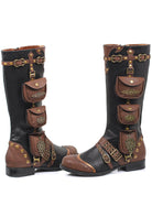 Industrial meets fantasy in these two-tone leatherette boots with brass hardware, utility straps, and embossed details. Perfect for post-apocalyptic cosplay, steampunk explorers, and Halloween warriors.