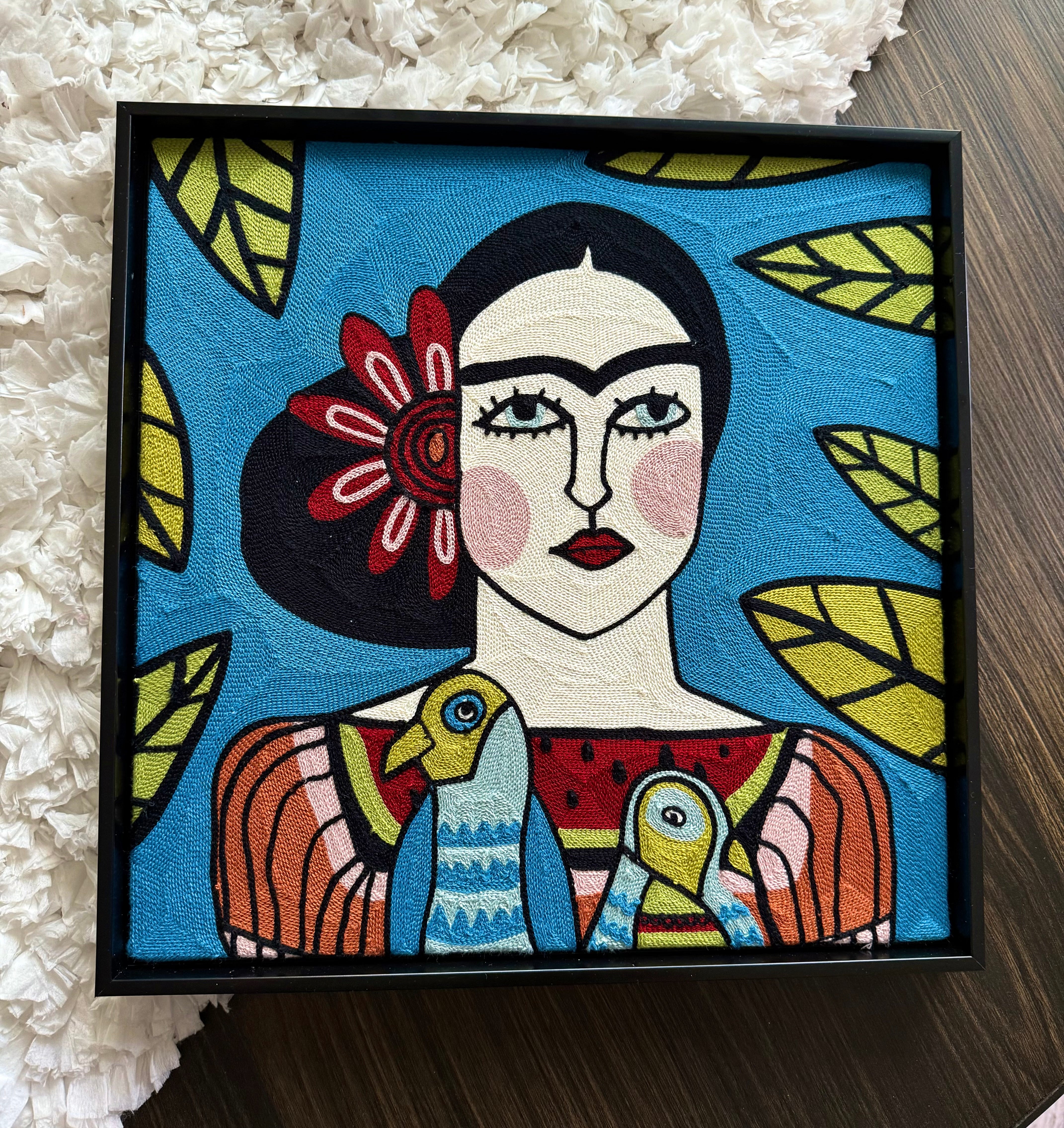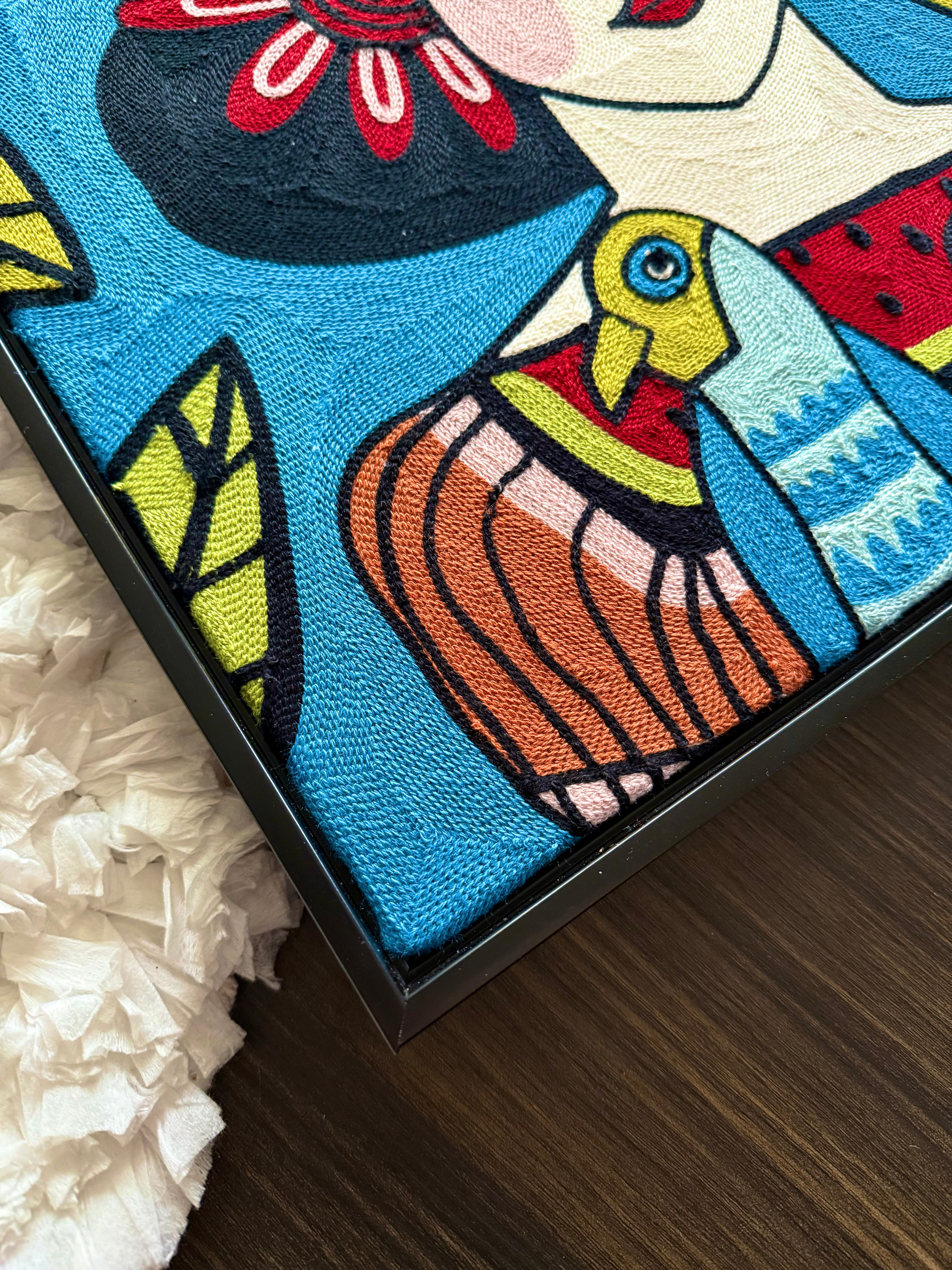 Woven Embroidered Textile Wall Art Frida Style Woman Birds Boho Decor 17”x17” BP